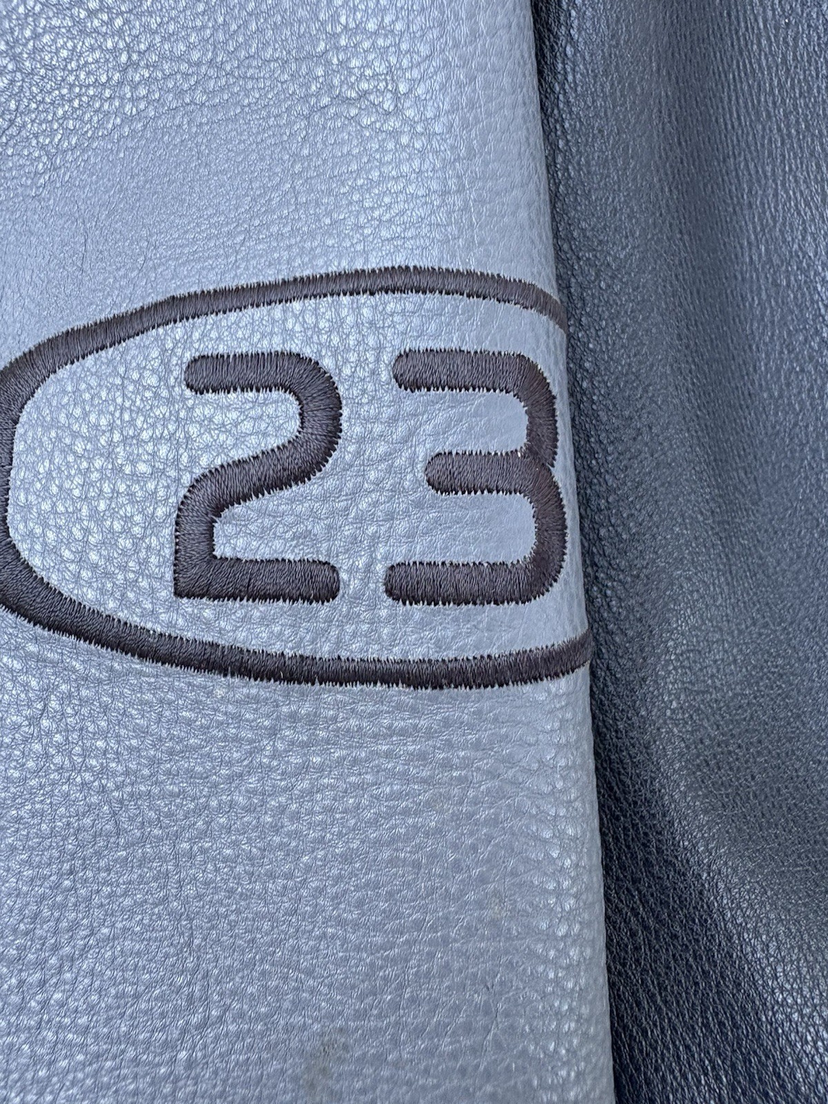 The product is a Jordan 23 Black Leather Jacket in size 2XL. Made with high-quality leather, this jacket features the iconic Jordan brand logo and is designed for men. The sleek black color adds a stylish touch to any outfit, making it a versatile and fashionable addition to any wardrobe. Perfect for those looking for a combination of luxury and streetwear fashion. Note fraying in the inside of jacket. Also the two front pockets have holes in them. Made in Indonesia.