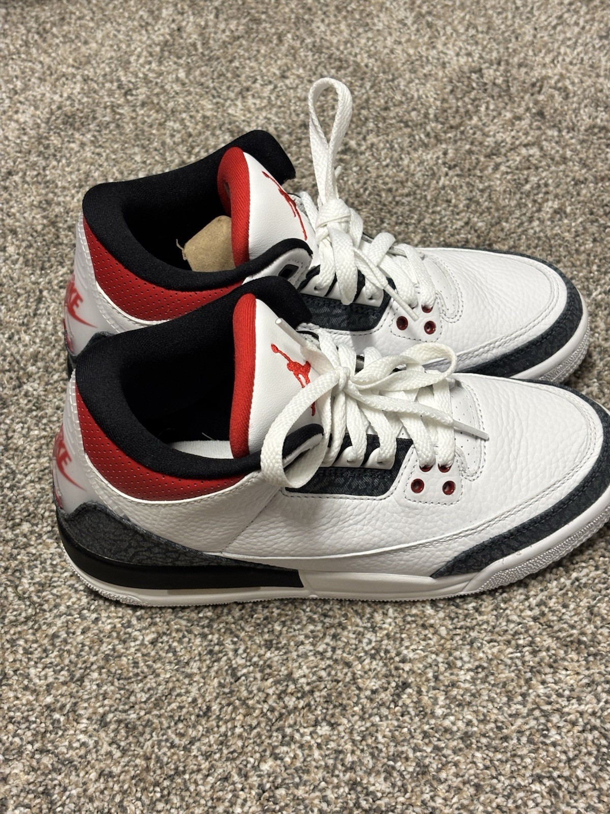 The Jordan 3 Fire Red sneakers in size 5 feature a classic Air Jordan 3 model with a color scheme of white, fire red, and cement grey. Released in 2007 as part of the Air Jordan product line, these athletic shoes bear the iconic Jordan brand and stylish sneaker design. The Fire Red nickname adds a bold and vibrant touch to this sneaker, making it a sought-after and nostalgic choice for sneaker enthusiasts and collectors alike.