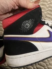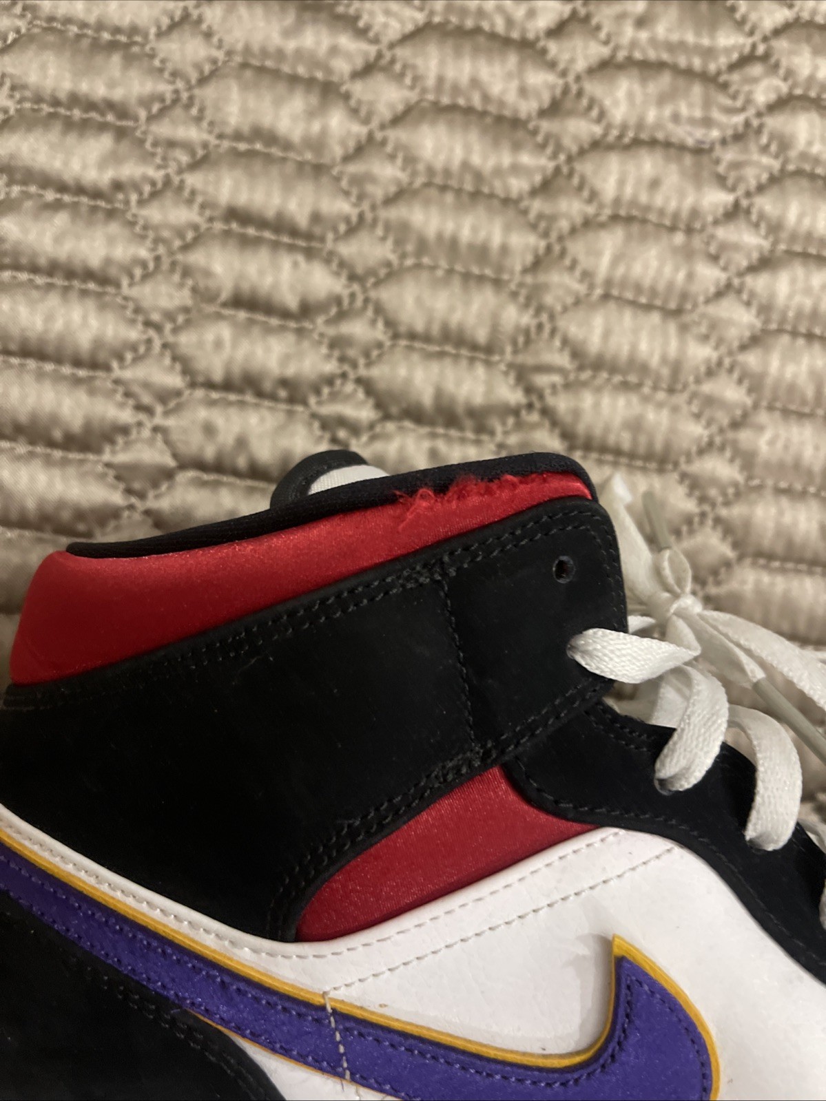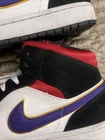 The Jordan Air 1 Mid Lakers Men's Sneakers in size 12 are a stylish and comfortable option for casual wear. Featuring a mid-top silhouette, lace-up closure, and leather upper material, these sneakers offer a classic Jordan design with a unique Lakers theme. The multicolor detailing and rubber outsole provide durability and traction, making them suitable for basketball or any athletic activity. Perfect for summer, fall, or spring, these sneakers are a great addition to any sneaker collection.