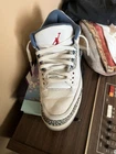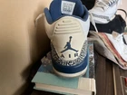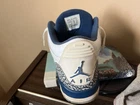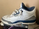 This is a pre-owned pair of Jordan Retro True Blue sneakers from 2001 in size 12 for men. They are part of the Air Jordan product line and feature a retro design. The sneakers are in the athletic style and bear the Jordan brand logo. They are not customized and are ideal for collectors or fans of vintage Jordan footwear.