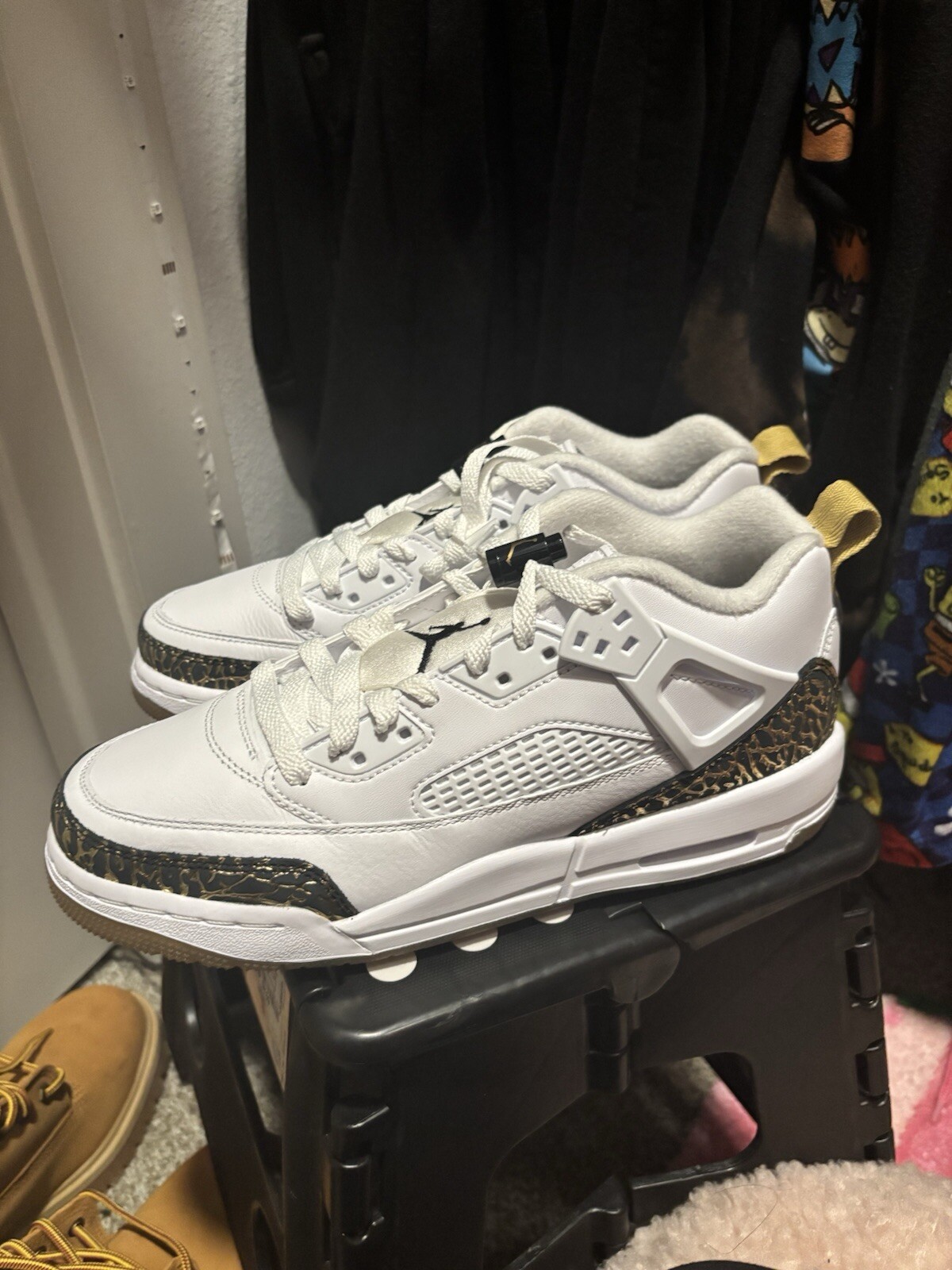 This is a pair of Jordan Spizike sneakers for men in size 7. They are low-top athletic shoes with a lace-up closure, featuring a white leather upper. These sneakers offer comfort and are designed for basketball performance. The model is part of the Jordan Spizike product line and is set for release in 2024.