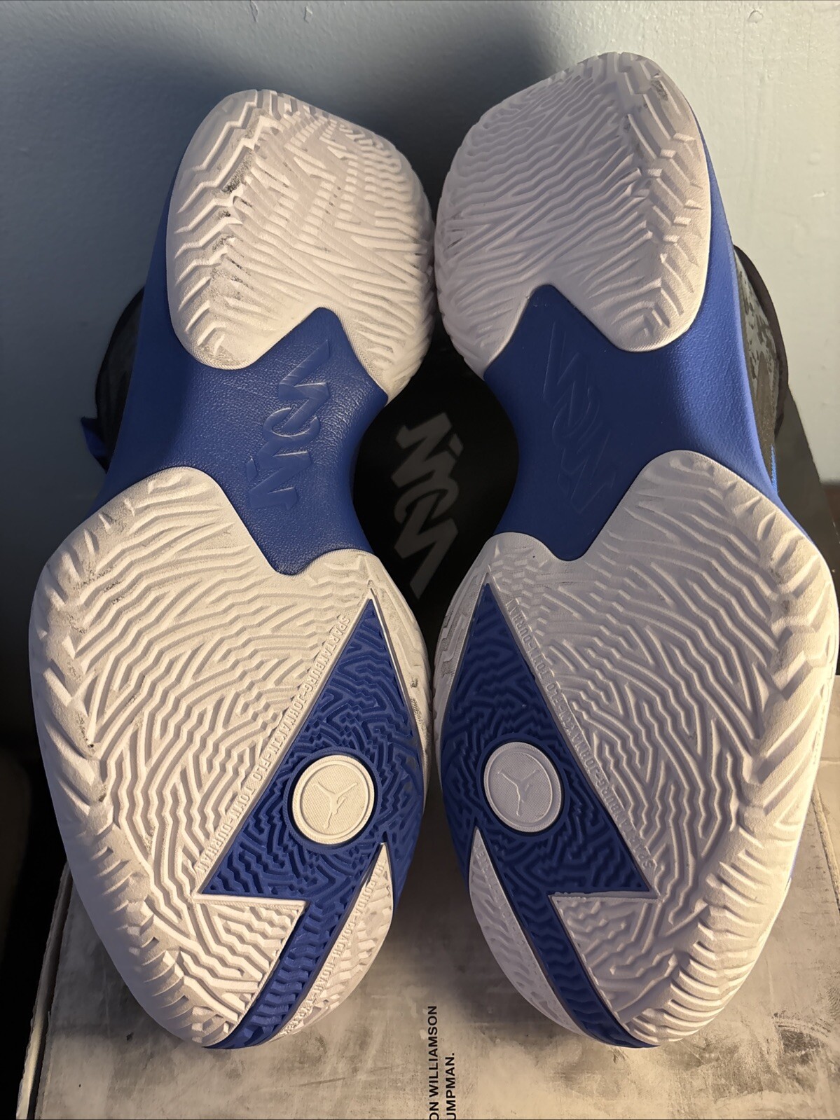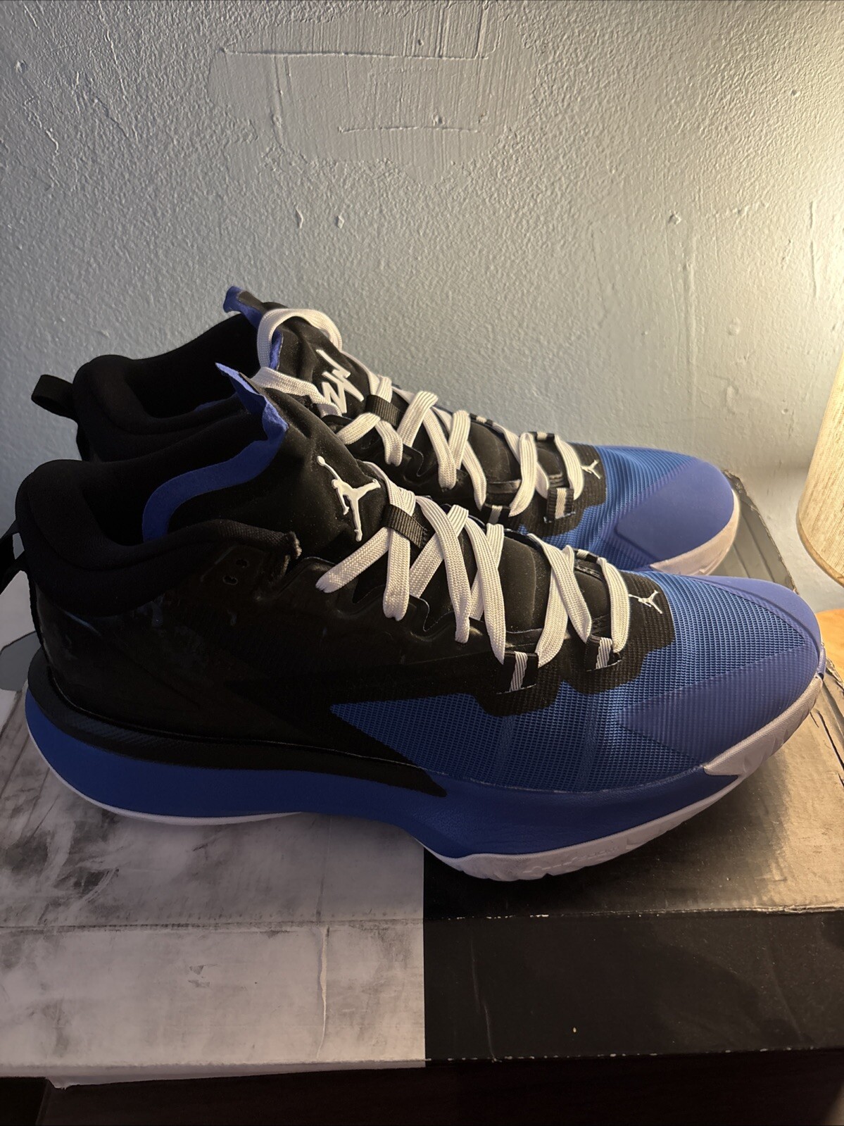 The Air Jordan 1 Zion is a stylish and performance-ready basketball shoe. This pair has been worn twice and remains in good condition, with minimal signs of wear. While the original box is damaged, the shoes themselves are well-maintained and offer excellent comfort, durability, and style, making them a solid choice for basketball or casual wear.