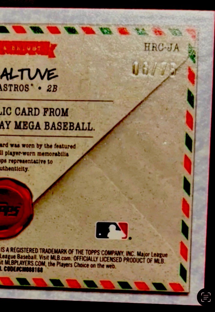 The product is a limited edition Jose Altuve Christmas worn hat trading card numbered out of 75. Manufactured by Topps, the card features memorabilia from the Houston Astros player and is in near mint condition. This collectible item is perfect for fans of Major League Baseball and sports trading cards, adding a unique and special piece to any collection.