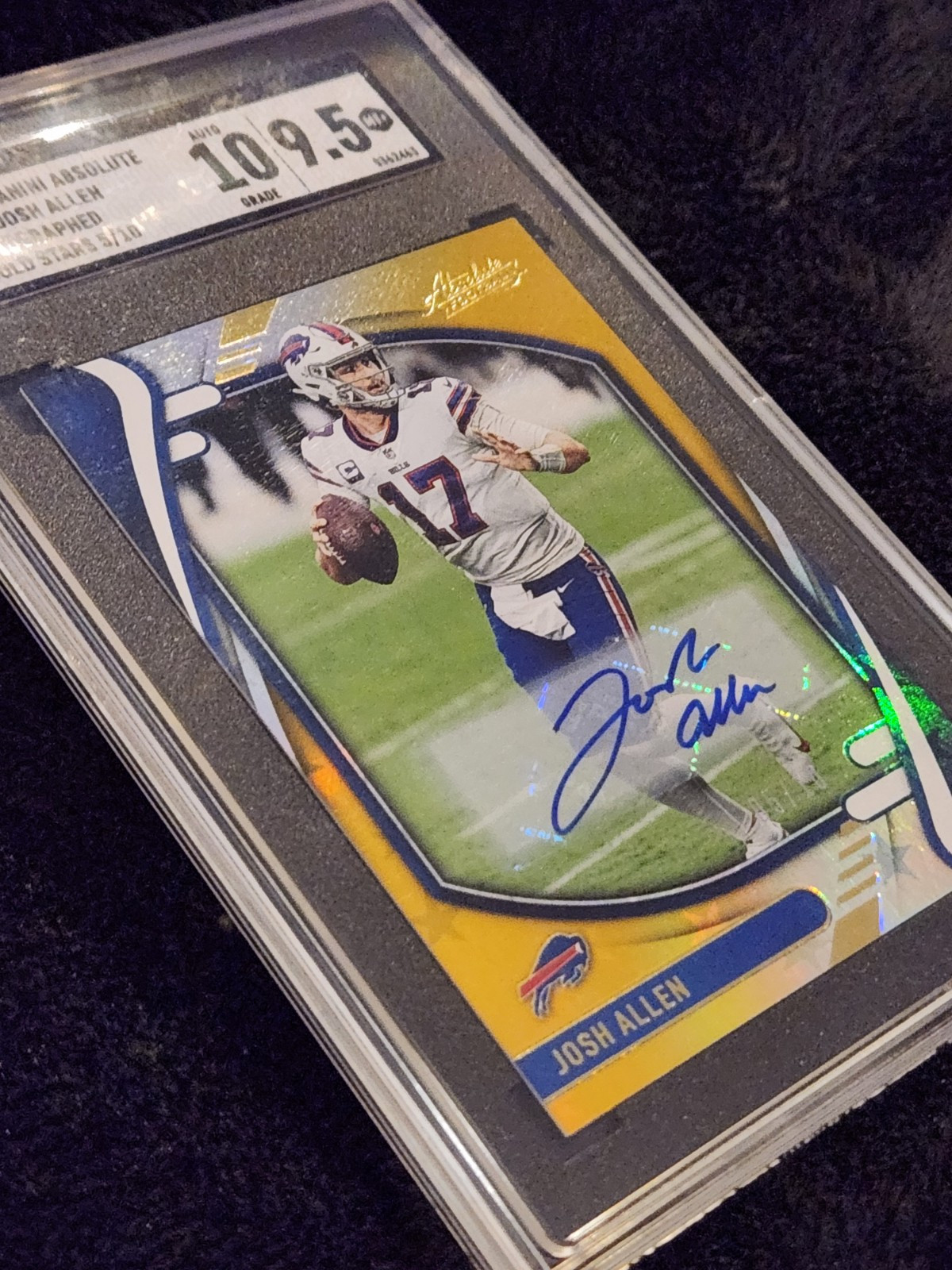 The product is a rare 2021 Panini Absolute Josh Allen Gold Stars autographed trading card, with a limited print run of only 10 copies. Graded as a PSA 10 by Sportscard Guaranty Corporation (SGC), this card features Allen from the Buffalo Bills in the National Football League (NFL). It is a highly sought-after collectible for football fans and card enthusiasts alike due to its premium quality, autograph, and extremely limited availability.
