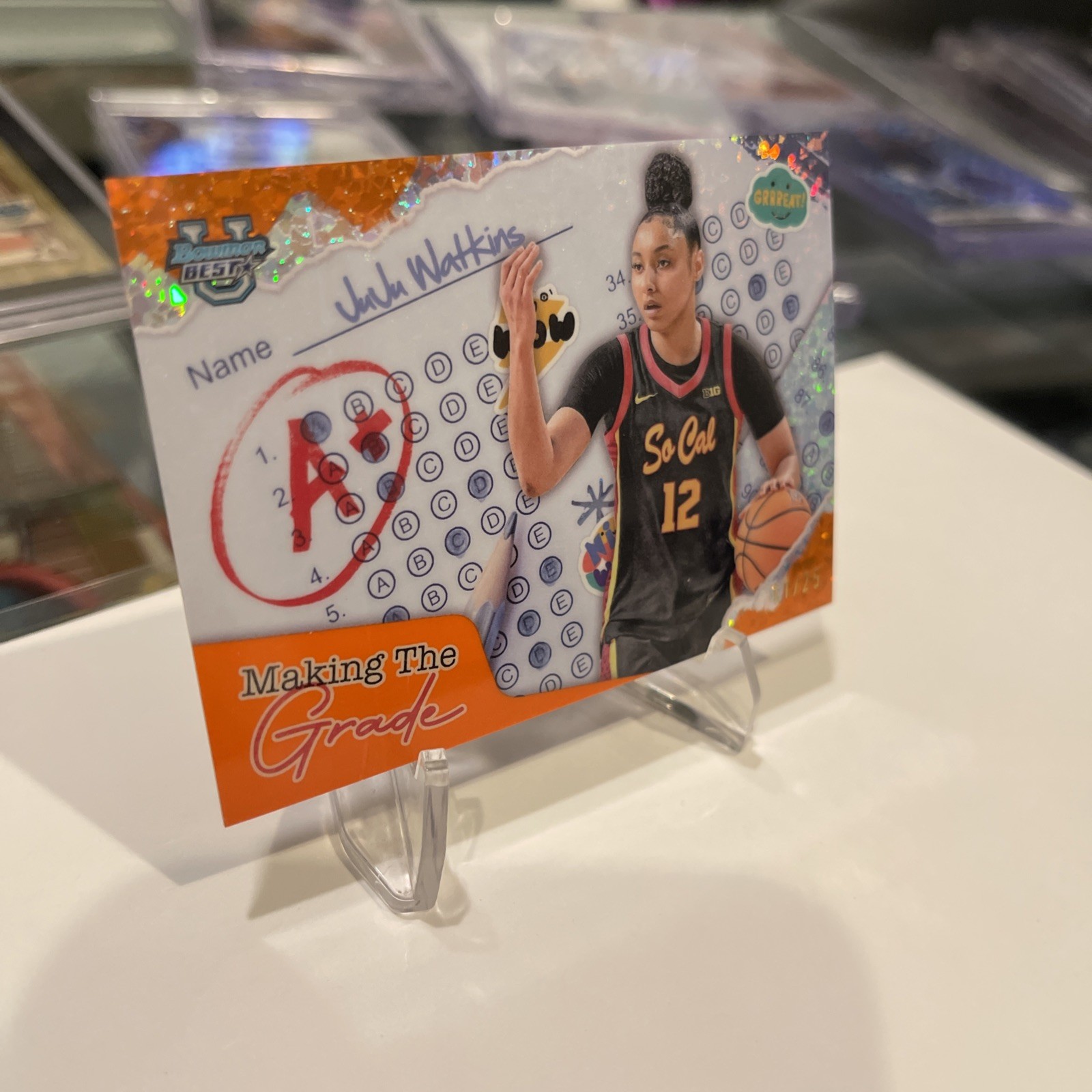 This card is an absolute gem for any collector! The vibrant orange diamond design pops, and with only 25 in existence, it’s a rare treasure. JuJu Watkins’ rookie star power makes this a standout piece—perfect for USC fans or anyone investing in future legends. The quality is top-notch, and it feels like holding a piece of basketball history. A fantastic addition to any collection!