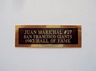 THIS AUCTION IS FOR THE NAMEPLATE ONLY !!!!!!! BOBBY'S HANG-UPS PREMIUM QUALITY ACRYLIC DISPLAY CASES AND CUSTOM ENGRAVED NAMEPLATES SINCE 1999 THESE NAMEPLATES ARE GREAT FOR DISPLAY CASES, FRAMED AND MATTED PHOTOS AND JERSEYS, SHADOW BOXES, PLAQUES, ETC. WE SPECIALIZE IN CUSTOM ORDERS OF ALL NAMEPLATES. WHETHER IT'S FOOTBALL, BASEBALL, BASKETBALL, HOCKEY, GOLF, BOXING OR ANY PERSONALIZED NAMEPLATE THAT YOU MAY NEED. WE CAN MAKE JUST ABOUT ANY NAMEPLATE THAT YOU ARE LOOKING FOR. PLEASE LIMIT THE AMOUNT OF TEXT TO 3 LINES ON THIS SIZE NAMEPLATE. OUR NAMEPLATES ARE TRIPLE ENGRAVED TO GUARANTEE CRISP, READABLE TEXT. NAMEPLATES ARE HAND POLISHED BEFORE SHIPPED TO MAKE SURE THE ENGRAVING REALLY STANDS OUT. ALL NAMEPLATES HAVE HIGH QUALITY DOUBLE SIDED TAPE TO ENSURE IT WILL STAY IN PLACE. CLICK HERE AND GO VISIT OUR EBAY STORE FOR MORE GREAT ACRYLIC DISPLAY CASES AND ENGRAVED NAMEPLATES !!!! PLEASE CHECK OUT OUR EBAY STORE, AND CHECK OUT ALL OF OUR ACRYLIC DISPLAY CASES AND NAMEPLATES. IF YOU DON'T SEE THE NAMEPLATE YOU ARE LOOKING FOR OR IF YOU ARE LOOKING TO PLACE A CUSTOM ORDER, PLEASE FEEL FREE TO EMAIL US AND WE WILL GET WORKING ON YOUR ORDER RIGHT AWAY. THANK YOU! THIS PURCHASE IS FOR A JUAN MARICHAL NAMEPLATE. IT IS BLACK ON BRASS BACKED ON POLISHED GOLD PLATING. THE NAMEPLATE MEASURES APPROX 1"x 3" IN TOTAL WITH ENGRAVED TEXT THAT READS: JUAN MARICHAL #27 SAN FRANCISCO GIANTS 1983 HALL OF FAME IF YOU ARE PURCHASING DIFFERENT TEAM OR PLAYER NAMEPLATES, AND DIFFERENT SIZES AT THE SAME TIME, PLEASE USE THE SHOPPING CART FEATURE AND PLEASE REQUEST A TOTAL BEFORE MAKING PAYMENT TO ENSURE YOU GET THE PROPER COMBINED SHIPPING DISCOUNT. Be sure to add me to your favorites list !
