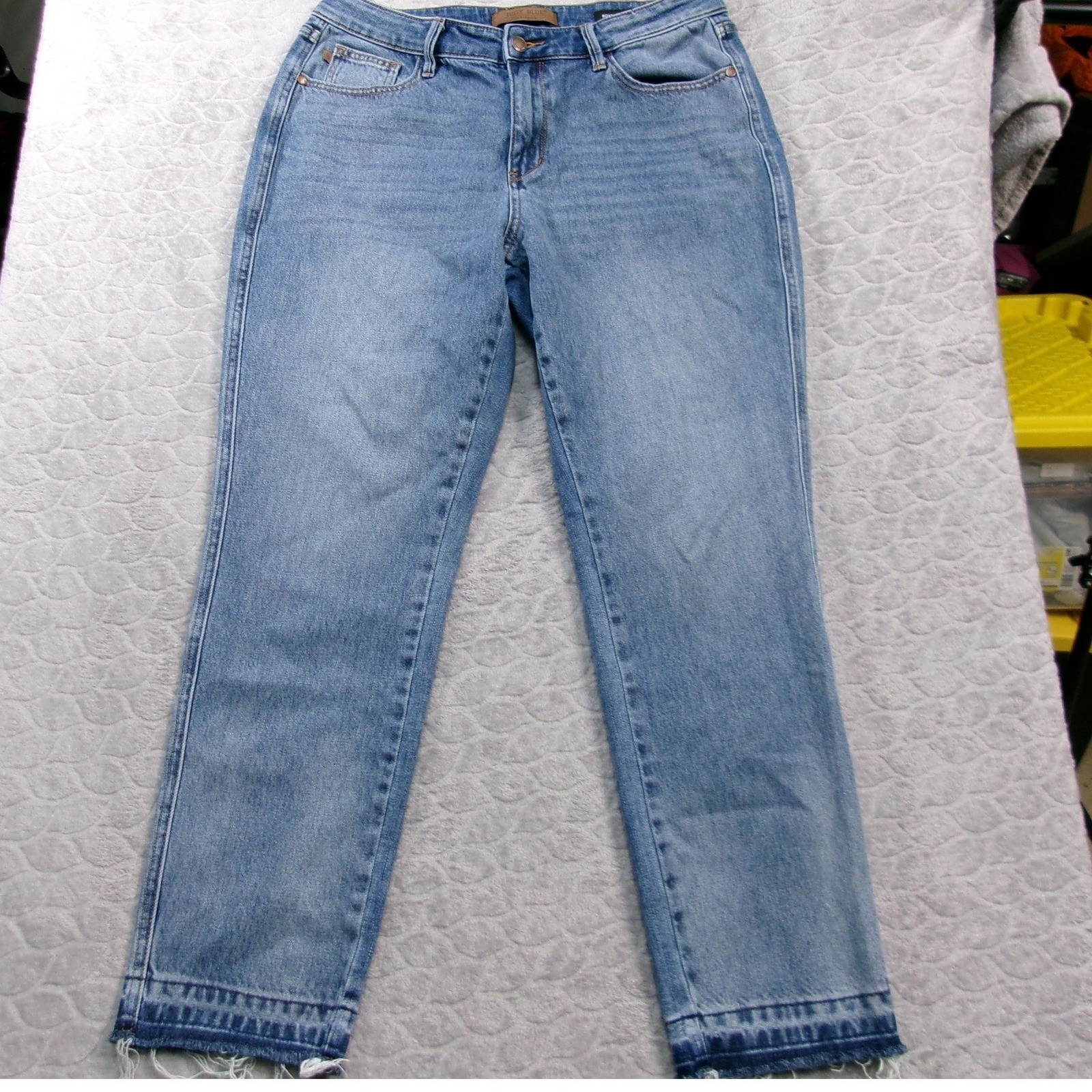 Embrace casual comfort and effortless style with these Judy Blue boyfriend jeans. The light wash denim offers a vintage feel, while the distressed detailing and frayed hem add a touch of modern edge. Designed for a flattering fit, these jeans are perfect for a weekend brunch, a concert outing, or a relaxed day of errands. Measurements: • Waist: 33 in • Inseam: 29 in • Rise: 9 in Style: Boyfriend Department: Women Fabric Wash: Medium Waist Size: 33 in Type: Jeans Accents: Fringe Features: Pockets, Distressed, Stretch Fit: Regular Pattern: Solid Rise: Mid (8.5-10.5 in) Fabric Type: Denim Inseam: 29 in Material: Cotton Blend, Lyocell, Polyester, Spandex Closure: Button Keywords: denim, distressed, frayed hem, light wash, boyfriend fit, casual, weekend wear, trendy, modern, everyday