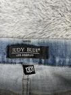 Brand: Judy Blue Style: Womens high-waist slim bootcut jeans in a medium blue wash stretch denim. Department: Women; Size on tag: 13/31 (juniors sizing). Color: Medium blue; Pattern: Solid with subtle fading and whiskering. Material: 52.2% cotton, 21.5% rayon, 23.4% polyester, 2.9% Lycra spandex; made in China. Closure: Zip fly with button closure and belt loops around the waistband. Details: Five-pocket styling with front scoop pockets and coin pocket, back patch pockets with Judy Blue leather logo patch, high waist rise, slim fit through the hip and thigh, slim bootcut leg opening, comfort stretch denim, and light distressed abrasions on the front legs. Style/Model information: Inner and hang tags show style JB88520 MD, size 13/31, color Medium Blue, RN# 116380, and branded notes "High Waist" and "Slim Boot." Care label instructions include handwash cold, wash dark colors separately, do not wring or twist, no bleach, lay flat to dry, and low iron.