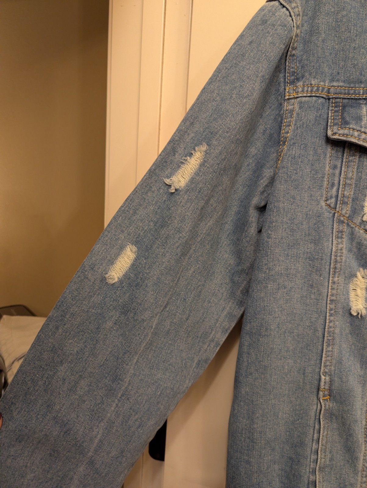 The Judy Bridal Women's Distressed Denim Jacket in XL size is a stylish and versatile addition to any woman's wardrobe. Made of 100% cotton denim in a classic denim blue color, this jacket features a button closure, long sleeves, and a regular fit. With a solid pattern and a vintage look without being too retro, it is perfect for casual occasions and travel. The jacket also includes pockets for added functionality, making it a practical and fashionable choice for fall, winter, and spring seasons.