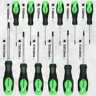 Made of Chrome vanadium steel with heat treatment,high hardness, large torque, long service life. Cushion grip handle for comfort and control,With ergonomic TPR handle and button on it, it helps you to use easily. Black finish blade with magnetic tips which could conveniently attracts screws. Set Includes: T5 x2-1/2", T6 x2-1/2", T7 x 2-1/2", T8 x 2-1/2", T9 x 2-1/2", T10 x 2-1/2", T15 x 4", T20 x 4", T25 x 4", T27 x 4", T30 x 4", T40 x 5"and a magnetic retriever . Widely used for maintenance and assembly of all kinds of mechanical equipment ,domestic appliances and furniture.