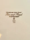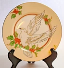This set includes 2 vintage Fitz & Floyd dessert plates from the Holly Dove Christmas pattern. The cream-colored porcelain plates feature a festive Christmas and Dove theme, making them perfect for holiday occasions. Made in Japan, these decorative plates are a charming addition to any Christmas table setting.