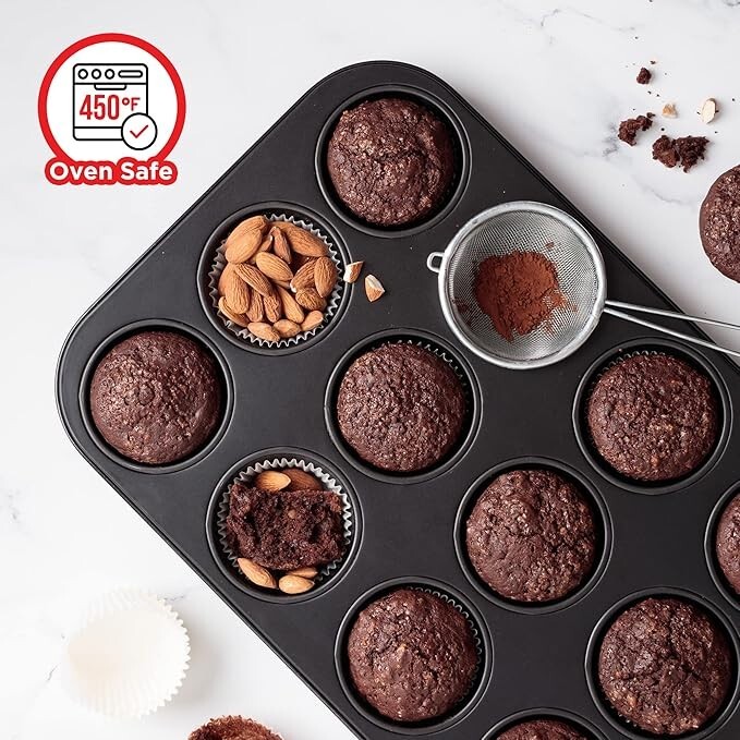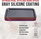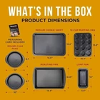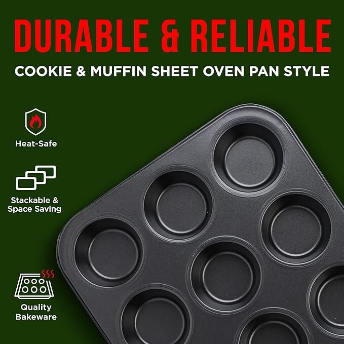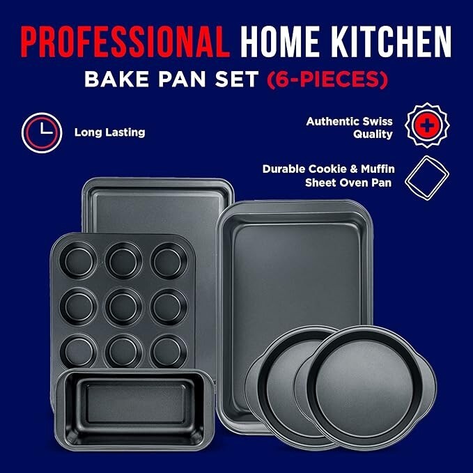 Juego de Utensilios Para Hornear Antiadherentes 6 Piezas, Moldes Pasteles Pizzas JUEGO DE HORNEAR: Renueva tus utensilios de hornear desgastados con nuestro juego de 6 piezas. Con calidad de restaurante, está hecho de acero al carbono flexible y antiadherente, y es de grado comercial para garantizar una larga vida útil y resultados de primera calidad. Para tu total tranquilidad, nos hemos asegurado de que cada pieza esté libre de PFOA, PFOS y PTFE. INFORMACIÓN DE TAMAÑO: El juego incluye 6 piezas: una bandeja para hornear de 36,5 x 24,4 x 5 cm, una bandeja para galletas mediana de 37,5 x 26,7 x 1,5 cm, dos moldes redondos para pasteles de 26,4 x 21,8 x 5 cm, un molde para pan de 25,4 x 14,5 x 5,7 cm y un molde para 12 muffins de 35,4 x 26,1 x 3 cm. Todos los artículos tienen un grosor de 0,5 mm. CALIDAD PREMIUM: Duraderos y fiables, todos los utensilios de cocina antiadherentes cuentan con un atractivo y elegante revestimiento de silicona negra antiadherente. Todas las piezas para hornear son duraderas, resistentes a las manchas y compactas gracias a su diseño apilable de bandeja ancha, lo que significa que no ocuparán mucho espacio en los armarios de la cocina. APTO PARA UNA VARIEDAD DE COCINAS: Asa carne en la bandeja para asar, prepara galletas en la bandeja para hornear, hornea pasteles de dos pisos, crea deliciosos panes y prueba tus habilidades con deliciosos muffins. Hay tantas opciones para hornear con nuestro juego de utensilios de cocina antiadherentes que no tendrás ni idea de dónde elegir. FÁCIL DE LIMPIAR: Totalmente apto para lavavajillas, pero recomendamos lavar a mano para obtener mejores resultados. Los moldes y la bandeja para hornear son aptos para horno, refrigerador y congelador, lo que los hace perfectos para una variedad de tus recetas favoritas, ¡y también para nuevas!
