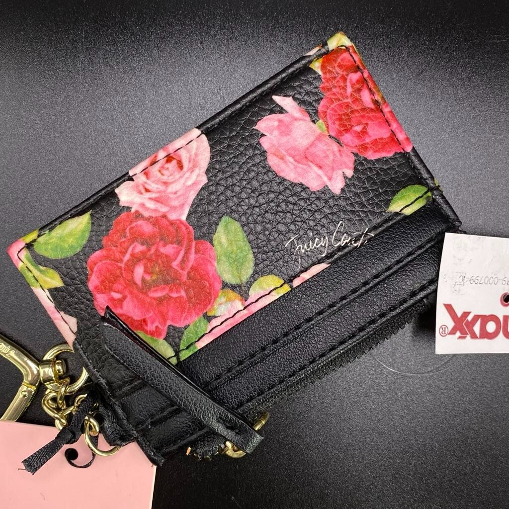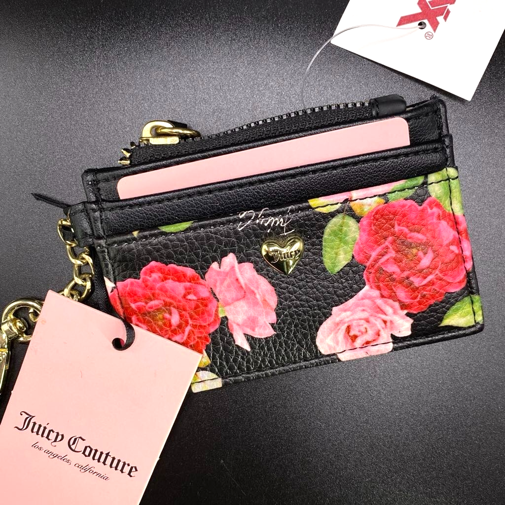 The Juicy Couture Wallet in black and pink floral design is a stylish and functional accessory for women. Made from faux leather with a microfiber fabric type, this keychain card case wallet features a floral pattern with heart and rose accents, as well as the iconic Juicy Couture logo. The compact size of 4 inches in length and 3 inches in width makes it convenient for on-the-go use, while the zipper closure and credit card slots offer both security and organization for your essentials. Perfect for adding a touch of feminine charm to your everyday look.
