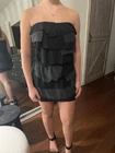 The product is a Juicy Couture strapless mini dress in size XS. It is black with ruffle accents, made of modal, lyocell, and silk materials. The dress is sleeveless and has a short length, suitable for party or cocktail occasions. It has a stylish and modern design, perfect for women looking for a trendy and chic outfit.