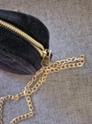 NWT JUICY COUTURE BLACK VELVET HEART SHAPED CROSSBODY BAG ON THE FRONT HAS CHERRYS WITH DIFFERENT COLORED RHINESTONES AND JUICY IN SILVER RHINESTONES GOLD METAL STRAP DROP IS APPROXIMATELY 21" L BAG MEASURES APPROXIMATELY 6" L × 5" W