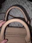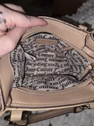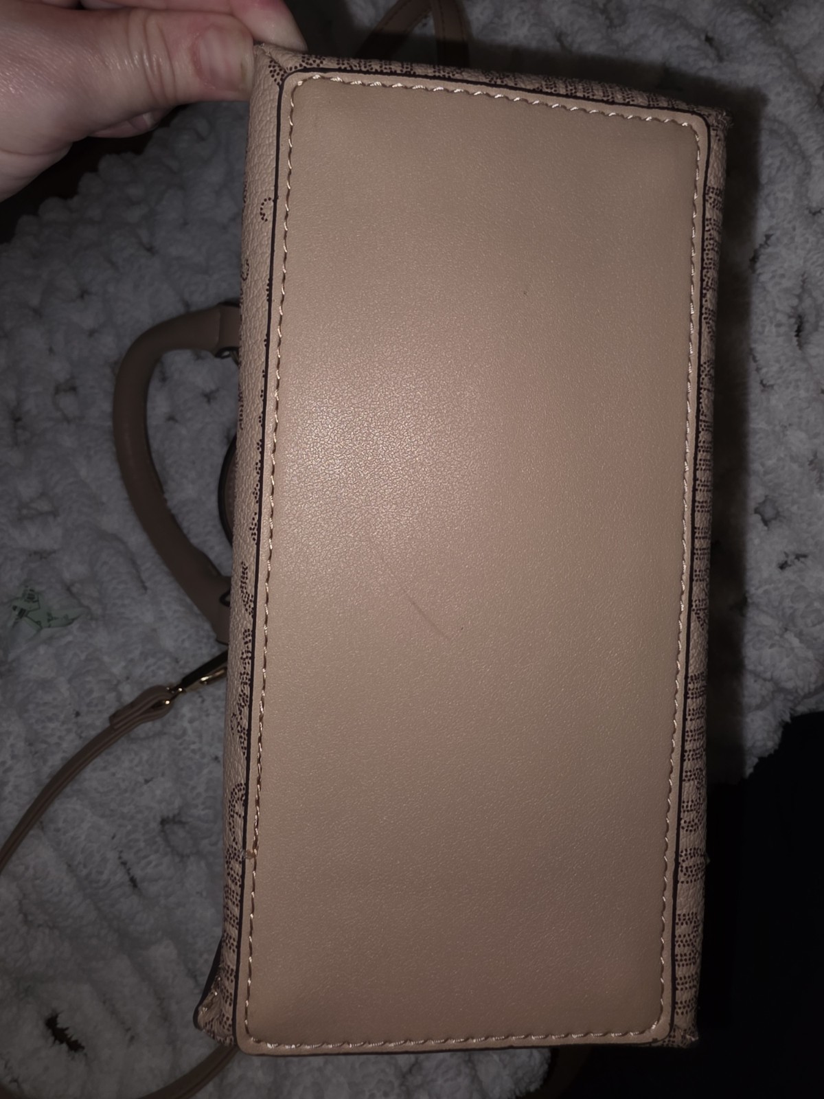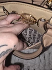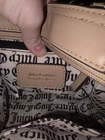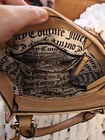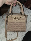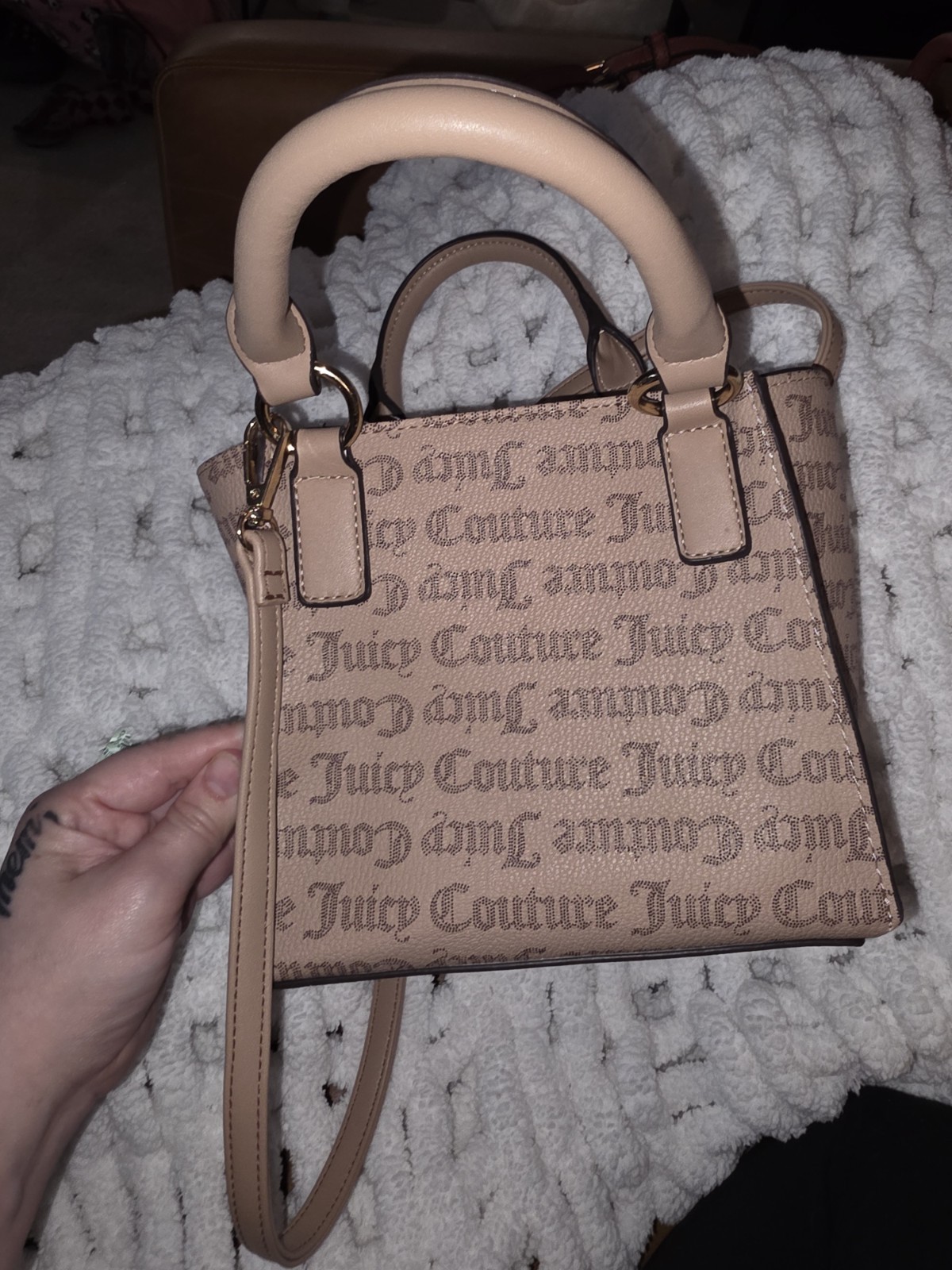 The JUICY COUTURE PURSE Medallion Mini Tote in Beige French Latte is a stylish and versatile bag perfect for various occasions. This mini tote features a rectangular shape with a zip closure, double handles in multicolor, and gold hardware accents. The exterior is made of faux leather with a Juicy Couture Dot Logo pattern, while the lining is beige fabric. It also includes a detachable strap for added convenience. This designer bag exudes a classic and preppy vibe, making it a must-have accessory for any fashion-forward woman.