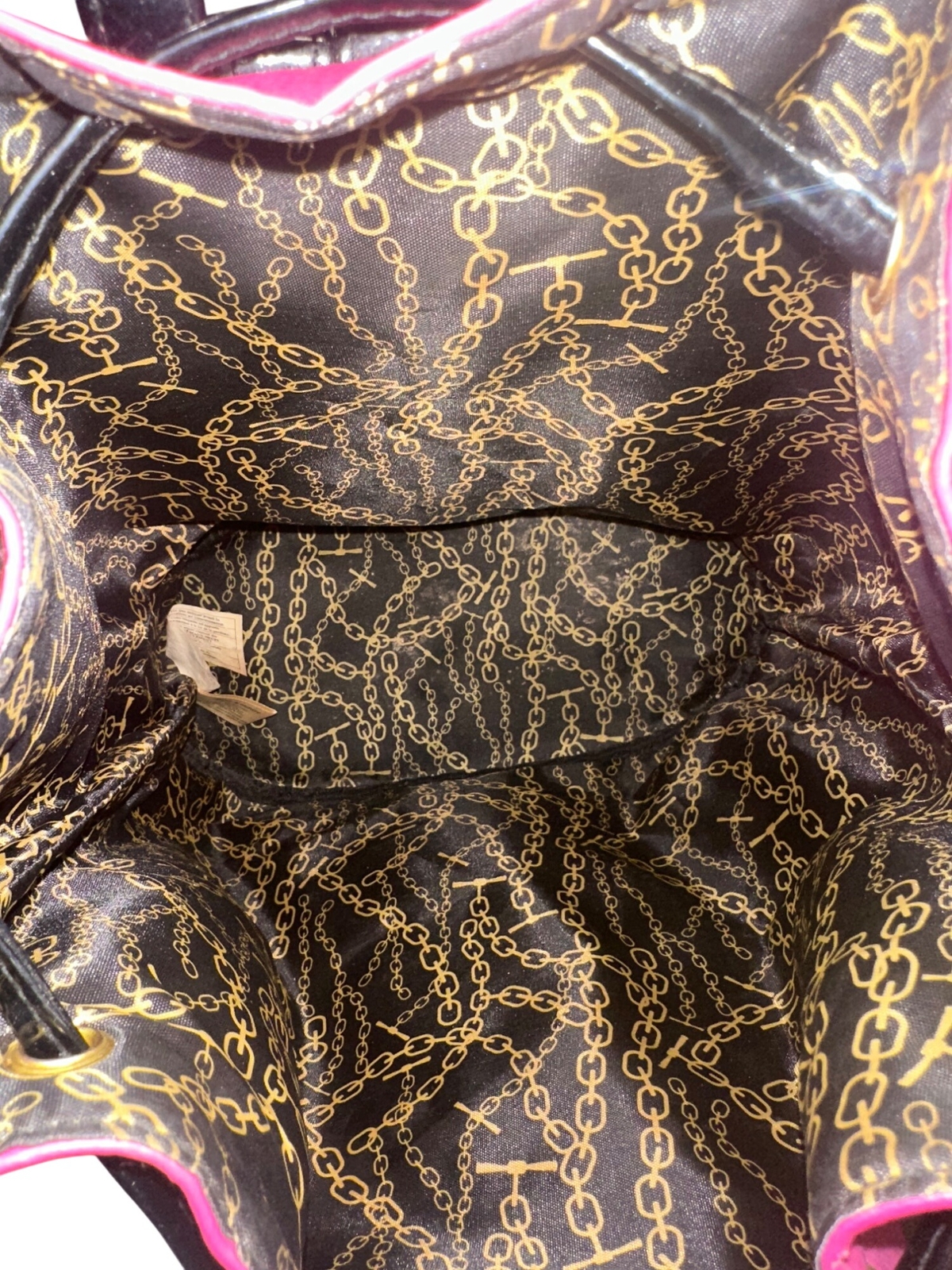 This vibrant Juicy Couture backpack is like carrying a pink party on your back. With its bold design and spacious interior, it'll turn heads and hold your essentials. The gold chain print lining adds a touch of sass, ensuring your belongings feel as fabulous as they are. • Adjustable black straps • Drawstring closure • Gold-tone hardware • Eye-catching design Some wear and stains on the exterior, discoloration on the pink which looks like purple marks minor scratches on the lining. Please see all the photos. Priced lower due to this. Condition: Pre-Owned Fair Pre-owned fair Please see all photos as they are part of the description. Always open to reasonable offers! Jewelry is never cleaned as we want to preserve its timeless beauty and aging. Vintage items tell a story and we would like you to see that story. It also allows the new owners to clean in a way that is right for them.