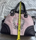 Juicy Couture Powder Blush Light Pink Velour Heritage Dome Satchel Bag Preloved Pink with dark brown, it looks black in pics and some lighting but I believe it’s more brown Two tiny marks on bag see images Also some make up stains inside really not to bad, I don’t know how to wash it out though 11X13X4