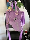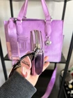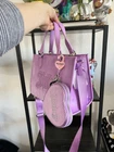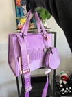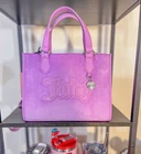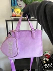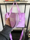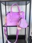The Juicy Couture UPGRADE YOU velour purse mini tote and wallet set is a stylish and versatile accessory for women. This mini tote features a rectangular shape with a purple exterior accented with pearls, rhinestones, and embroidered details. The bag has a magnetic closure, adjustable crossbody strap, and inner pockets lined with beige canvas fabric. The set also includes a matching wallet, perfect for travel, parties, or casual outings. The Juicy Couture branding and Y2K theme add a touch of designer flair to this limited edition collection. Next day shipping and packaged with care. Smoke and pet free home.