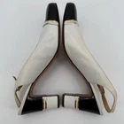 Great condition with minor signs of wear as pictured. The Julianelli Pretender Heels are a pair of vintage women's shoes from the 1950s, made in Italy. With a preppy look and a mix of white, black, and gold colors, these size 10 N heels are perfect for formal occasions. Crafted from leather, these original shoes exude a classic sophistication that is sure to make a statement. Ideal for those looking to add a touch of retro glamour to their ensemble, these heels are a timeless piece of fashion history.