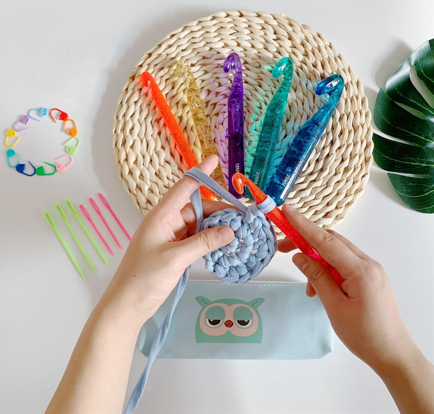 Large Crochet Hooks,25mm 20mm 18mm 15mm 12mm Features: Large Crochet Hooks Set:The crochet hook set includes 5 large crochet hooks(12mm 15mm 18mm 20mm 25mm),6 yarn needles with 10 stitches markers.Crochet hooks are from 12mm to 25mm,suitable for chunky yarn Perfect Gift:The crochet hooks and accessories are packed in a compact case,portable and easy to store.The color of the crochet hooks is pretty.The crystal-like appearance offers good mood.Crochet hooks are perfect gifts for everyone who loves crocheting Easy to Use:Our smooth huge crochet hooks won't snag yarn and comfortable to hold.Crochet hooks are perfect to make large blankets,pet mats and other large projects and more Enjoy Crocheting:The crochet hook kit includes 25 mm 20 mm 18 mm 15 mm 12 mm crochet hooks.Different sizes meet your basic needs.The size is marked on both sides of the crochet hook,easy to identify Quality service:We never stop striving for better quality and products.If you are not satisfied with the crochet hook set,please feel free to contact us,we will provide you with the best solution