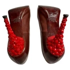 Just Cavalli Brown Leather Peep Toe Heels with Red Bubble Heel – Unique & Eye-Catching Design - Size 37 1/2 Step into luxury and make a statement with these stunning Just Cavalli high heels . Crafted from rich brown leather , these shoes feature a peep toe design and intricate gold-painted dot accents along the edges for subtle detail. The most striking feature? The vibrant red sculptural heel , designed to resemble a cluster of bubbles or gemstones. Made from glossy, durable material, this avant-garde heel adds an artistic, bold touch that sets these shoes apart from the ordinary. Perfect for collectors, fashion lovers, or anyone who wants to stand out at an event! Details: • Brand: Just Cavalli • Color: Brown (Upper), Red (Heel) • Material: Leather Upper, Glossy Red Heel • Style: Peep Toe, Statement Heel • Heel Height: 4 Inches *. Platform Height: 1/2 Inch • Size: 37 1/2 • Condition: Pre-Owned – Good condition Why You’ll Love Them: ✔ Unique sculptural red bubble heel ✔ High-quality leather with gold accent details ✔ Bold yet versatile—perfect for evening wear or making a statement Don’t miss out on owning this rare designer piece!