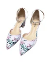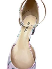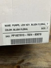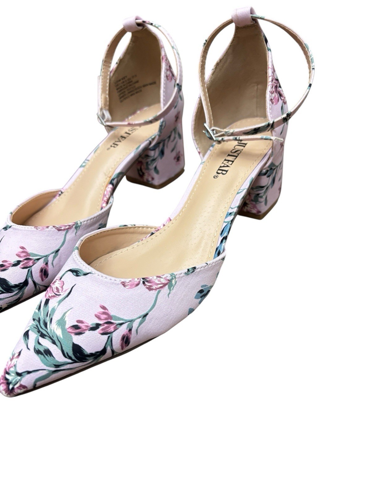 The product is a pair of Just Fab floral fabric ankle strap low-key pumps in blush floral, size 7. These stylish heels feature a closed toe, buckle closure, and a mid-height block heel. The multicolor floral pattern and ankle strap add a feminine touch, making them perfect for parties or cocktail events during the summer and spring seasons. These pumps are from the JustFab brand and come in a box, making them a lovely addition to any woman's shoe collection. Box included.