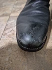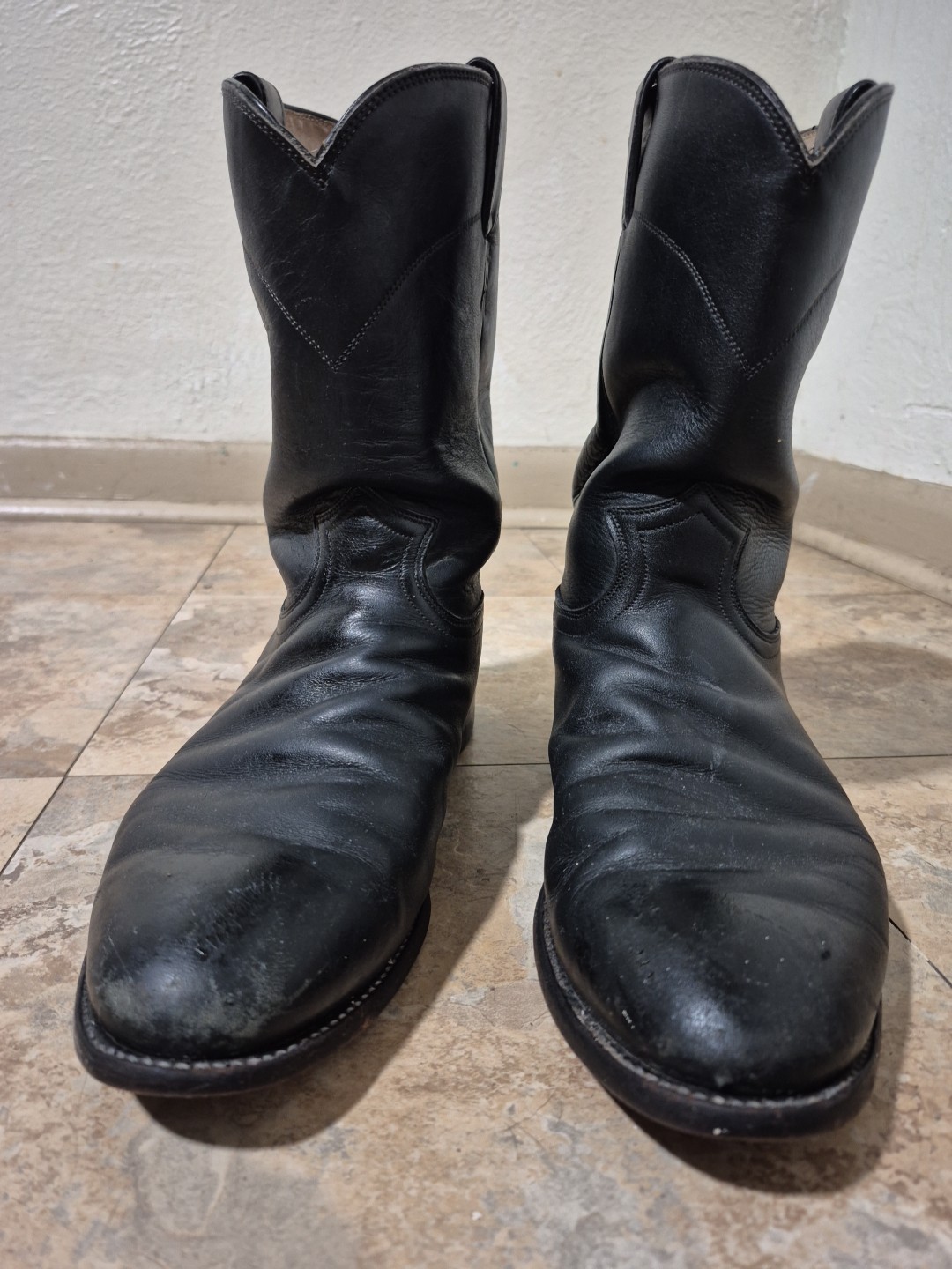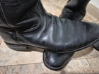 The heels, soles, and leather are all in good condition, minus a few scratches. Step into timeless style with the Justin Boots 3133 Roper, a classic black leather boot that embodies the spirit of the West. Crafted for comfort and designed to last, these mid-calf boots feature a durable leather outsole, a comfortable leather insole, and a smooth leather lining. The round toe shape ensures a comfortable fit, while the easy pull-on closure makes them a practical choice for any occasion, from a casual day out to a business setting. Attention to detail is evident in the intricate embroidery and the signature Justin Boots logo accent, adding a touch of sophistication to the rugged design. Whether you're dressing for a night on the town or heading to work, these versatile boots are suitable for a wide range of events and seasons. The solid black color and understated style make them a superb addition to any wardrobe, reflecting a blend of nature-inspired themes and timeless American heritage.