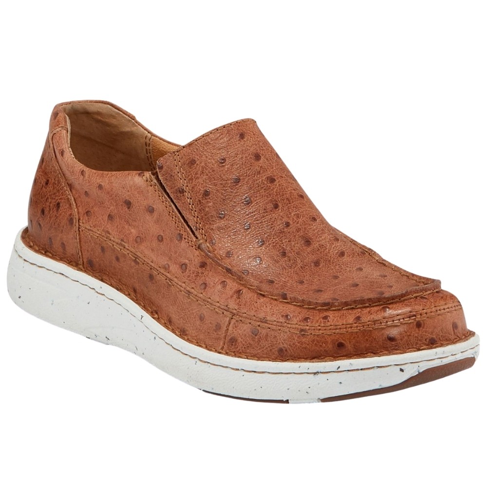 Looper Ostrich Print Slip On Shoes Product Details Leather upper Slip on entry Side elastic gores Cushioned footbed Rubber outsole Crafted in ostrich-print cowhide, its durable, flexible design and cushioned insole deliver the relaxed comfort you need after a long day of riding. The Justin Casuals collection features stylish, comfortable and lightweight footwear, crafted with the Opanka technique which returns energy to your foot giving a trampoline effect with every step. Additional Details Color: Brown Occasion: Casual Gender: Mens Age: Adult Brand: Justin Boots