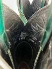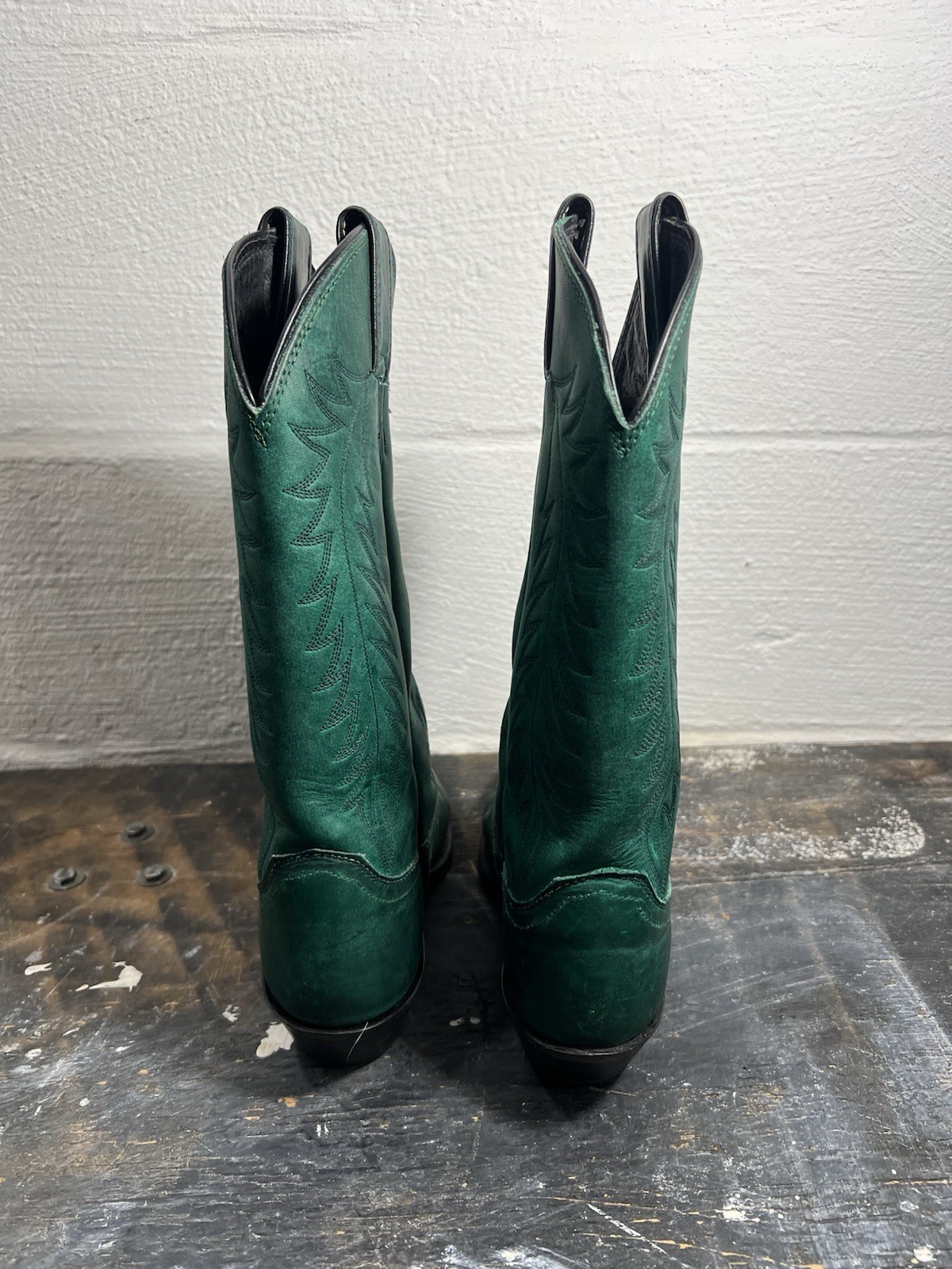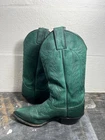 These Justin Boots Women's Green Damiana Western Cowgirl boots in size 5.5 feature a pointed toe and a low block heel, making them comfortable for all-day wear. The boots are adorned with embroidered accents, showcasing a Western style with a coastal cowgirl twist. The mid-calf shaft style and leather outsole make them durable and perfect for various occasions such as casual outings, formal events, and workwear. These boots are a great addition for those who love a boho, cowgirl look with a touch of glamour.