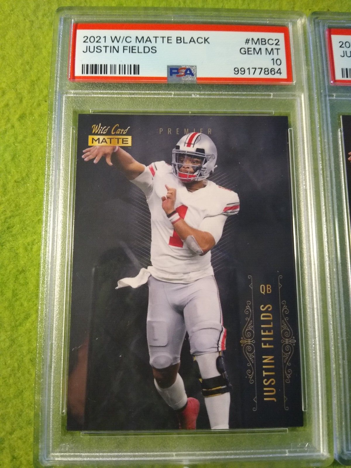 2 Graded NFL Football Cards- Justin Fields. Included are: 1) 2021 Wild Card Matte Black Justin Fields #MBC2, Graded PSA 10, Gem Mint. #99177864. 2) 2021 Wild Card Matte Gold Justin Fields #MBC2, Graded PSA 10, Gem Mint, #99177863. Free shipping.