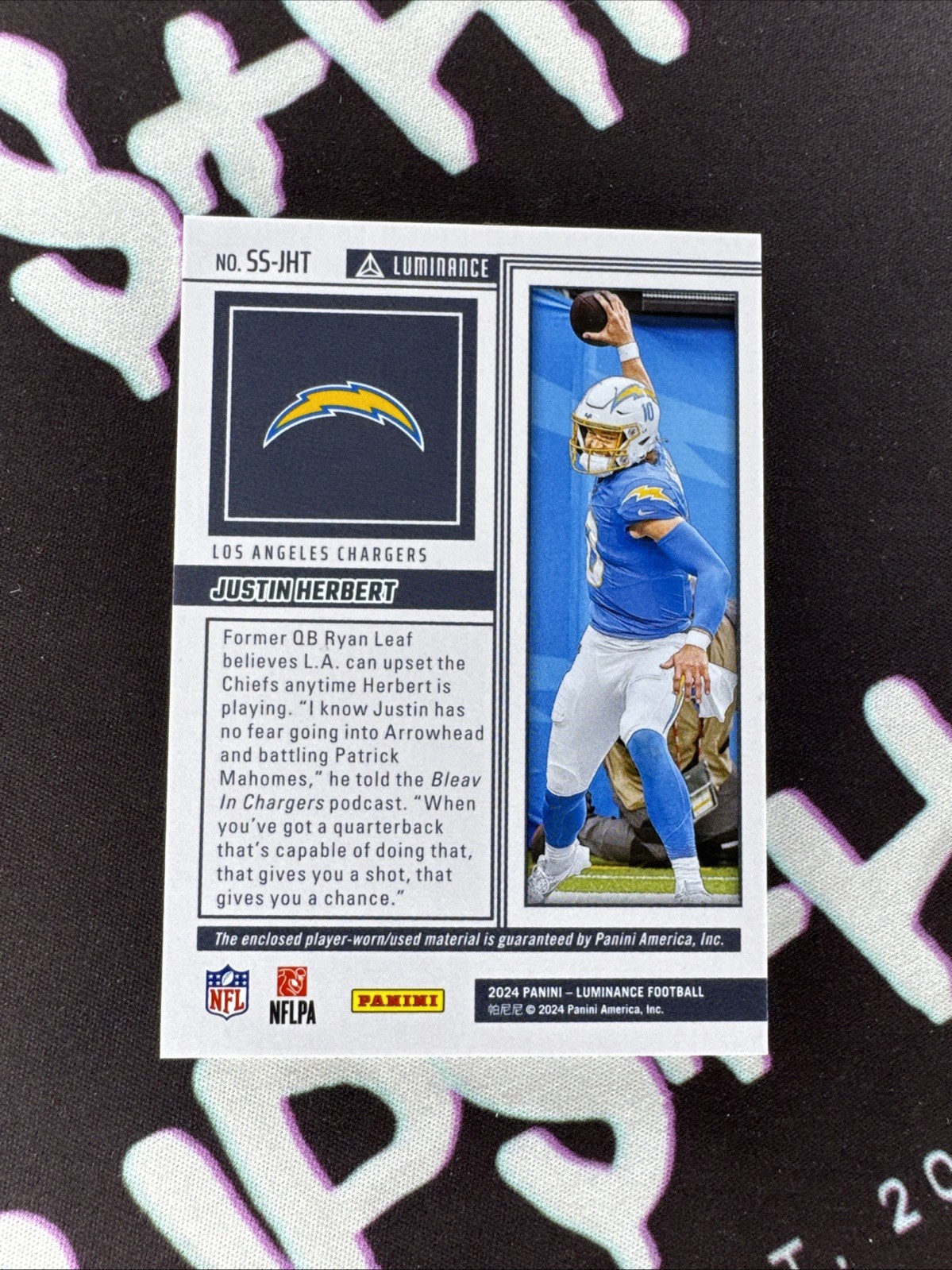 The product is a 2024 Panini Luminance Spirit Swatches trading card featuring player-worn patch from NFL player Justin Herbert of the Los Angeles Chargers.