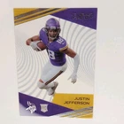 Elevate your sports card collection with the Justin Jefferson 2020 Panini Chronicles - Clear Vision Rookies #CV-11. As a standout addition, this card showcases the Minnesota Vikings' dynamic receiver in his rookie season, capturing the essence of his promising career in the National Football League. The card's clear acetate design provides a premium feel, making it a standout piece for enthusiasts and fans alike. Crafted by Panini, a trusted name in sports memorabilia, this card belongs to the esteemed 2020 Panini Chronicles set and is a part of the exclusive Clear Vision Rookies insert. It is not autographed, allowing Jefferson's action shot to take center stage. With its pristine presentation and significant rookie status, it holds a special place in any football card collection.