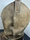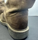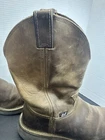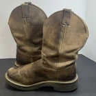 Preowned condition. These are Justin Original Workboots for men in tan leather with a natural distressed finish. They are mid-calf Western boots with a round toe shape and pull-on closure. The outsole is made of rubber for slip resistance. These cowboy-style boots are designed for casual or workwear occasions and are a size 8.5D. The model number is Justin Style 4444.
