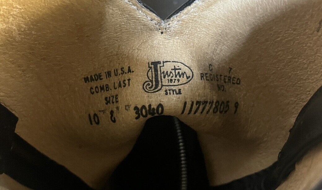 Men's black leather Justin Roper Western Boots in size 10 3E. These mid-calf boots feature a pull-on style with a solid pattern and a cowboy theme. Made of leather with a leather lining, they have a Western style suitable for cowboy enthusiasts. The outsole and insole are also made of leather, providing quality and comfort for the wearer.
