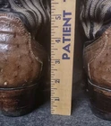 My grandpa bought these in the 80's and resoled them 3 times because he loved them so much. They really don't make them like this anymore and while they're not in pristine condition, they have more character than any brand new pair could aspire to have. Flaws are pictured of course These Justin Boots are a rare find for any cowboy or Western enthusiast. Made from high-quality full quill leather, these boots feature a pointed toe and a mid-calf shaft style. The pull-on closure and wingtip design add to the overall unique look of these boots. With a two-toned abstract pattern and embroidered accents, these boots are perfect for any occasion, from casual outings to formal events. The lightweight design and comfortable fit make them ideal for all-day wear. Don't miss your chance to own a piece of Western history with these vintage Justin Boots.