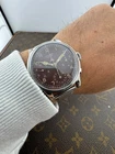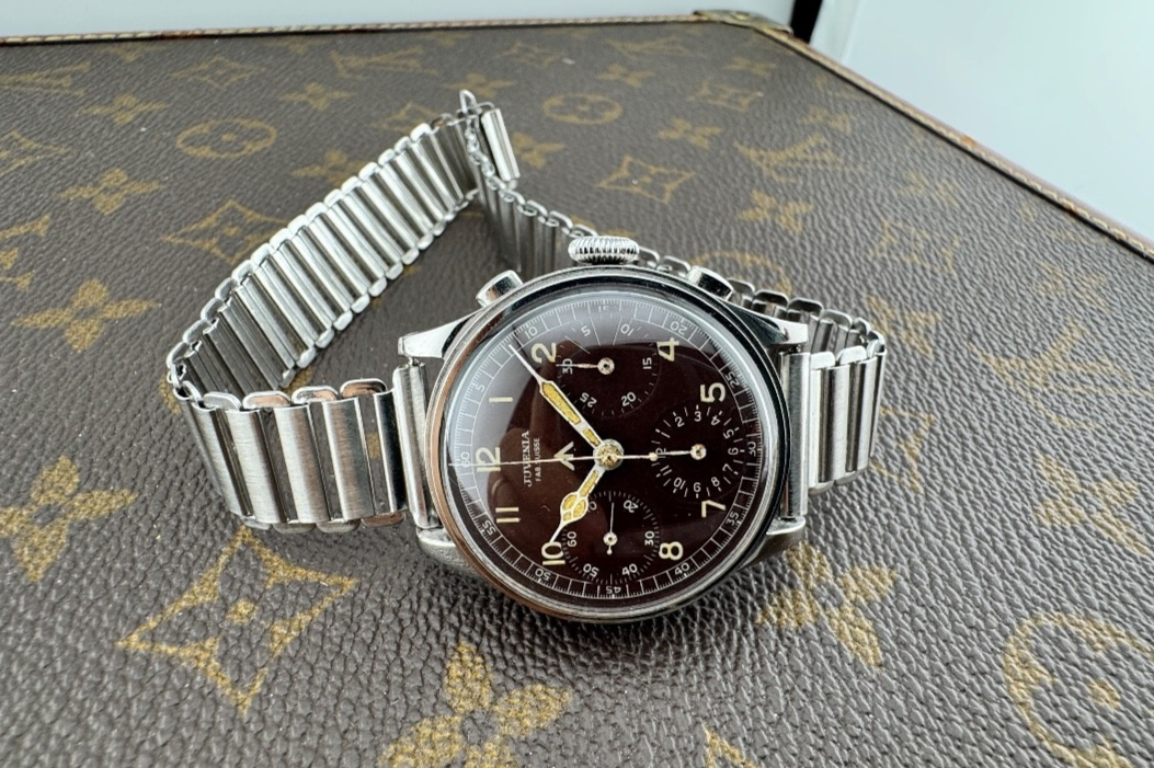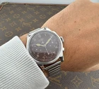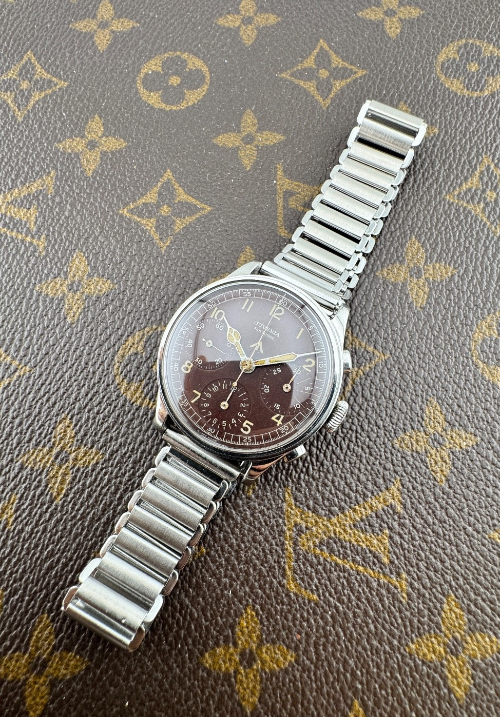 OGGI PROPONIAMO , Questo è un fantastico cronografo prodotto intorno agli anni 1950 ,con un calibro prestigioso , valjoux 71 , cassa in acciaio staybrite e accompagnato da questo fantastico quadrante marrone trizio -Marca: J U V E N I A FAB.SVISS -Cassa: ACCIAIO STAYBRITE DA 37MM ESCLUSA CORONA , FONDELLO A SCATTO ORIGINALE -Movimento : VALJOUX 71 ORIGINALE COEVO IN TUTTE LE SUE PARTI -Vetro: PLEXYGLASS -Corona: ORIGINALE -Ghiera; FISSA ,IN ACCIAIO A SCALINO -Tasti: ORIGINALI A OLIVA IN ACCIAIO INOX -Quadrante: MARRONE TRIZIO -Lancette: ORIGINALI SMALTO BIANCO E TRIZIO -Cinturino/Bracciale: ACCIAIO DA 18/19MM MODELLO BAMBOO VINTAGE IN STILE CON QUESTO FANTASTICO CRONOGRAFO -Scatola e documenti: NOSTRA POCHETTE IN VELLUTO COMPRESA -Condizioni : OTTIME -Revisionato: SI -Uomo/donna/unisex: UOMO PER QUALSIASI DUBBIO CONTATTATEMI ,RISPONDEREMO IL PRIMA POSSIBILE !
