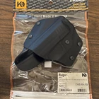 The K Rounds Ruger SR22 OWB Pancake Holster RH is designed for right-handed shooters looking for a field/hunting holster. Made of Kydex material in black color, this lightweight and weather-resistant holster is specifically for Ruger SR22 pistols in .22 Long Rifle caliber. It features a forward cant for a comfortable carry position at 2, 3, 4, or 5 o'clock on the belt. This American-made holster offers secure attachment with a belt loop and is suitable for outdoor activities.