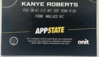 KANYE ROBERTS #14 - 2024 OnIt Athlete Base Card #B-17. APPALACHIAN STATE UNIVERSITY FOOTBALL RUNNING BACK. Home town: Wallace, NC. Wallace-Rose Hill High School Bulldogs. Shipping only to the Continental United States. Card will be shipped with eBay standard shipping envelope no later than next day (Except weekends & holidays). This card was put into penny sleeve and toploader straight out of pack. Card shown will be shipped.