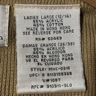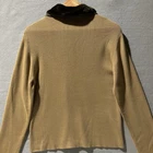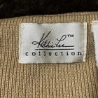 The Kathie Lee Collection vintage sweater in size L features a camel color with a faux fur collar placket, adding a touch of luxury to the classic cardigan style. The tight-knit fabric and raglan sleeves make it a comfortable and stylish choice for various occasions, from travel to workwear. The vintage design with a zippered closure and pop of color accents gives it a retro vibe that is perfect for the winter and fall seasons. Made in Hong Kong, this lightweight sweater is machine washable and a versatile addition to any woman's wardrobe. AS IS - Measurements show apprx 19.2" Pit to pit, and 23.5" Length