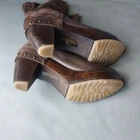 suede and leather platform booties wooden block heels Rubber sole round toe pull on tab scuffs on leather and minor scuffs on heels, see pictures, please