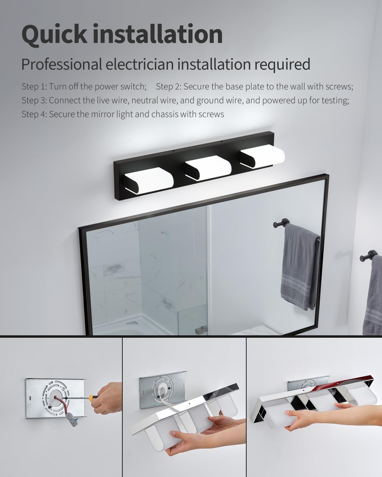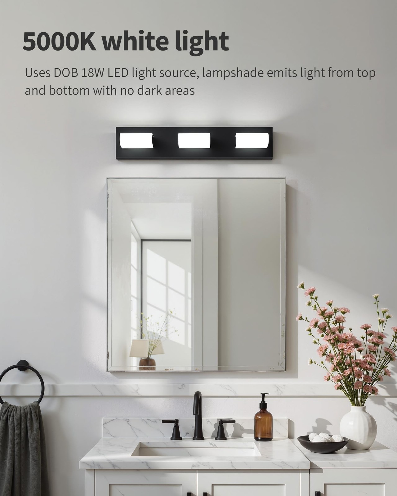 KDG LED Modern Bathroom Vanity Light Fixtures, 3 Lights Matte Black 5000K Wall Lighting Over Mirror, Lights for Dressing Room, Bedroom, 21.6 inch Product Details Color: Matte Black Size: 3-Light, 21.6 inch, 5000K Brand: KDG MPN: AMZ-TBL-070 UPC: 705399841172 EAN: 0705399841172 Brand: KDG Color: Matte Black Installation Type: Wall Mount Number of Light Sources: 3 Item Weight: 3 Pounds Product Dimensions : 21.6 x 4.13 x 4.33 inches; 3 Pounds Item model number : AMZ-TBL-070 Date First Available : July 4, 2025 Manufacturer : Zhongshan Cook Lighting Co., Ltd. Customer Reviews: 4.2 4.2 out of 5 stars (20) Brand: KDG Color: Matte Black Installation Type: Wall Mount Number of Light Sources: 3 Item Weight: 3 Pounds Bulb Base: E26 Switch Type: Toggle Unit Count: 1.0 Count Water Resistance Level: Not Water Resistant Efficiency: High Efficiency Fixture Type: Non Removable Manufacturer: Zhongshan Cook Lighting Co., Ltd. Size: 3-Light, 21.6 inch, 5000K UPC: 705399841172 Part Number: AMZ-TBL-070 Item Weight: 3 pounds Product Dimensions: 21.6 x 4.13 x 4.33 inches Item model number: AMZ-TBL-070 Assembled Height: 4.33 inches Assembled Length: 21.6 inches Assembled Width: 4.13 inches Batteries Required?: No Date First Available: July 4, 2025 5000K Makeup Light: Equipped with three 5000K cool color temperature LED bulbs with 18W, it is not only energy efficient but also more durable than traditional bulbs. Molded in one piece with crisp edges and a smooth silhouette, it is simple and modern. Easy to Install: This modern vanity light features and installs in just 15 minutes. Equipped it is hardwired to fit a standard US backplate, requiring no additional assembly. The fixture mounts above the mirror and is ready to use by connecting to the pre-wired connections and securing it to the wall. Multiple applications: Widely used in bathrooms, mirror cabinets, bedrooms, living room vanity areas Find the most suitable light to provide clear and bright illumination. High Quality and Durability: The black mirror front light body is made of iron, and the silver mirror front light body is made of stainless steel; not only sturdy but also more durable. The lampshade is made of high quality acrylic material, which provides even light dispersion and avoids glare, ensuring a comfortable lighting experience for long time use. After-sales service: KDG vanity lights are suitable for bathrooms, dressing rooms, or any place that requires mirror lighting due to their stylish appearance. If you have any questions after receiving your package, please feel free to contact us. We will be happy to provide assistance and offer a satisfactory solution!