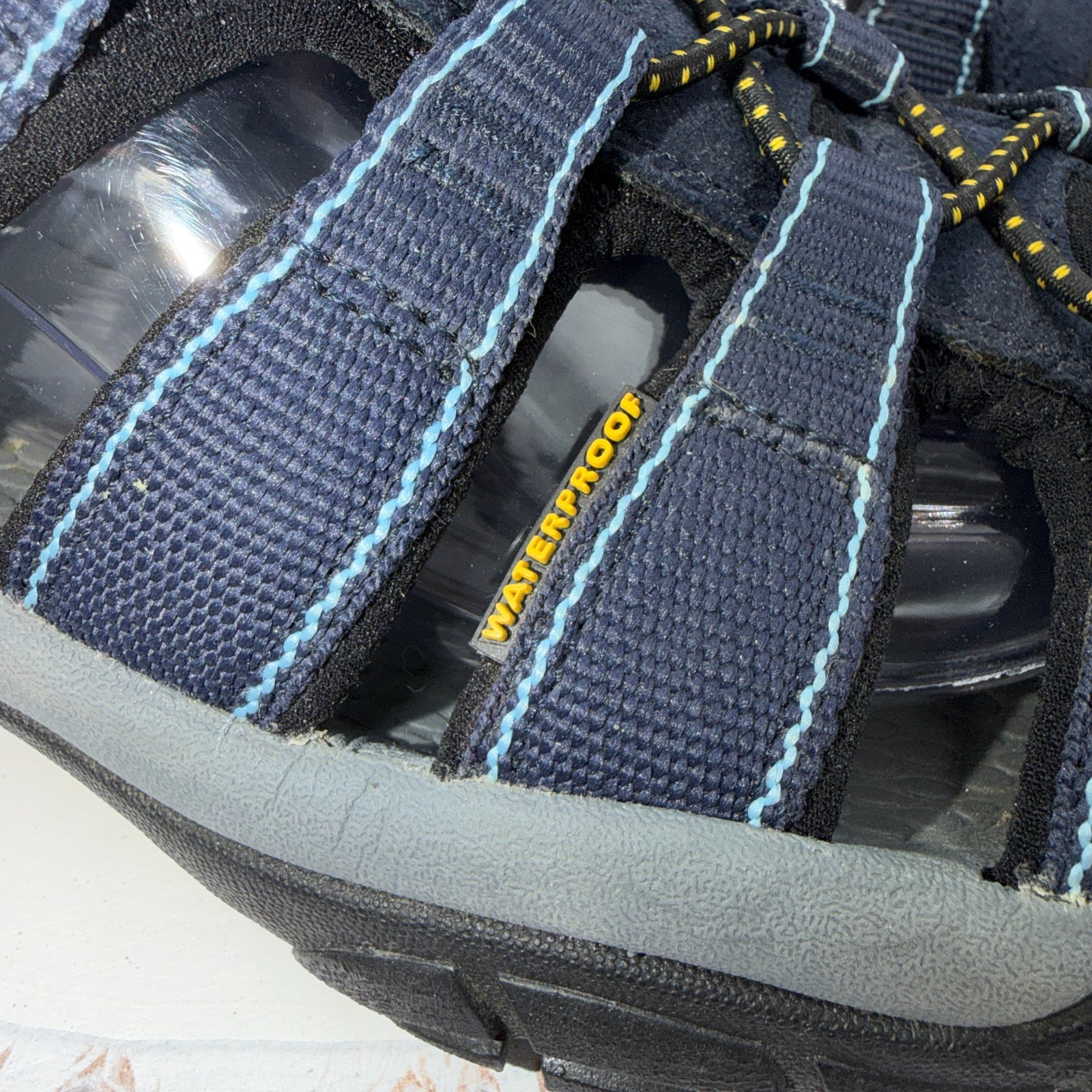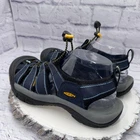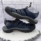 The KEEN Newport H2 Closed Toe Sandals in Blue Black are designed for water hiking and outdoor activities. These women's size 10 sandals feature a rubber outsole for traction and a waterproof upper material for durability. With a drawstring closure and low top shaft style, these athletic sneakers are perfect for summer, fall, and spring adventures. The solid blue color and rubber cleat type add a stylish and functional touch to these trail sandals, making them a versatile choice for beach outings and sports activities.