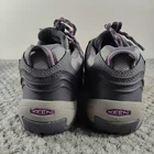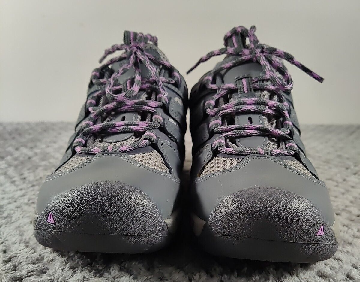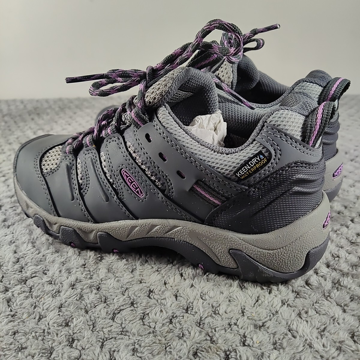 KEEN 1025157 Koven Waterproof Hiking Shoes for Ladies - Steel Grey/African Violet - 6.5M ***See picture for one missing insert*** Enjoy KEEN® performance with waterproof comfort on the trail with the Koven Waterproof Hiking Shoes for Ladies. Waterproof synthetic uppers give hikers ventilated support and protection over trails, thanks to quick-dry linings and KEEN.DRY waterproof /breathable technology inside. Underfoot, the Koven's removable polyurethane insoles and EVA midsoles cushion and support your feet over any trail. The Koven also features KEEN's heel capture system and stability shanks under the feet for extra stability over uneven terrain. Non-marking KEEN.ALL-TERRAIN rubber outsoles feature 4mm multi-directional lugs for superior traction over changing trail terrain. Speed lace webbing system. Odor-control treatments to resist odor. Manufacturer style #: 1025157. Great trail performance with everyday comfort Waterproof synthetic uppers Quick-dry linings KEEN.DRY waterproof /breathable technology Removable polyurethane insoles Shock absorbing EVA midsoles – supports and cushions Heel-capture system and stability shanks for added stability over rough, uneven terrain KEEN.ALL-TERRAIN rubber outsoles – 4mm multidirectional lugs Proven toe caps for added protection