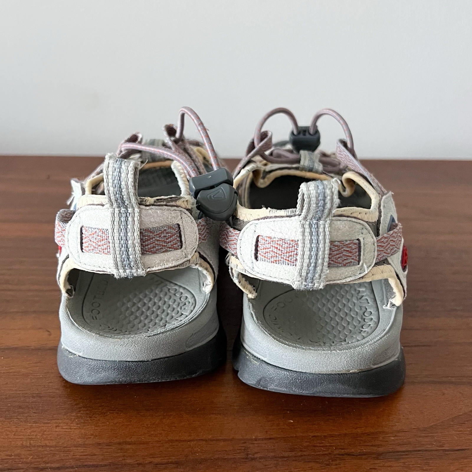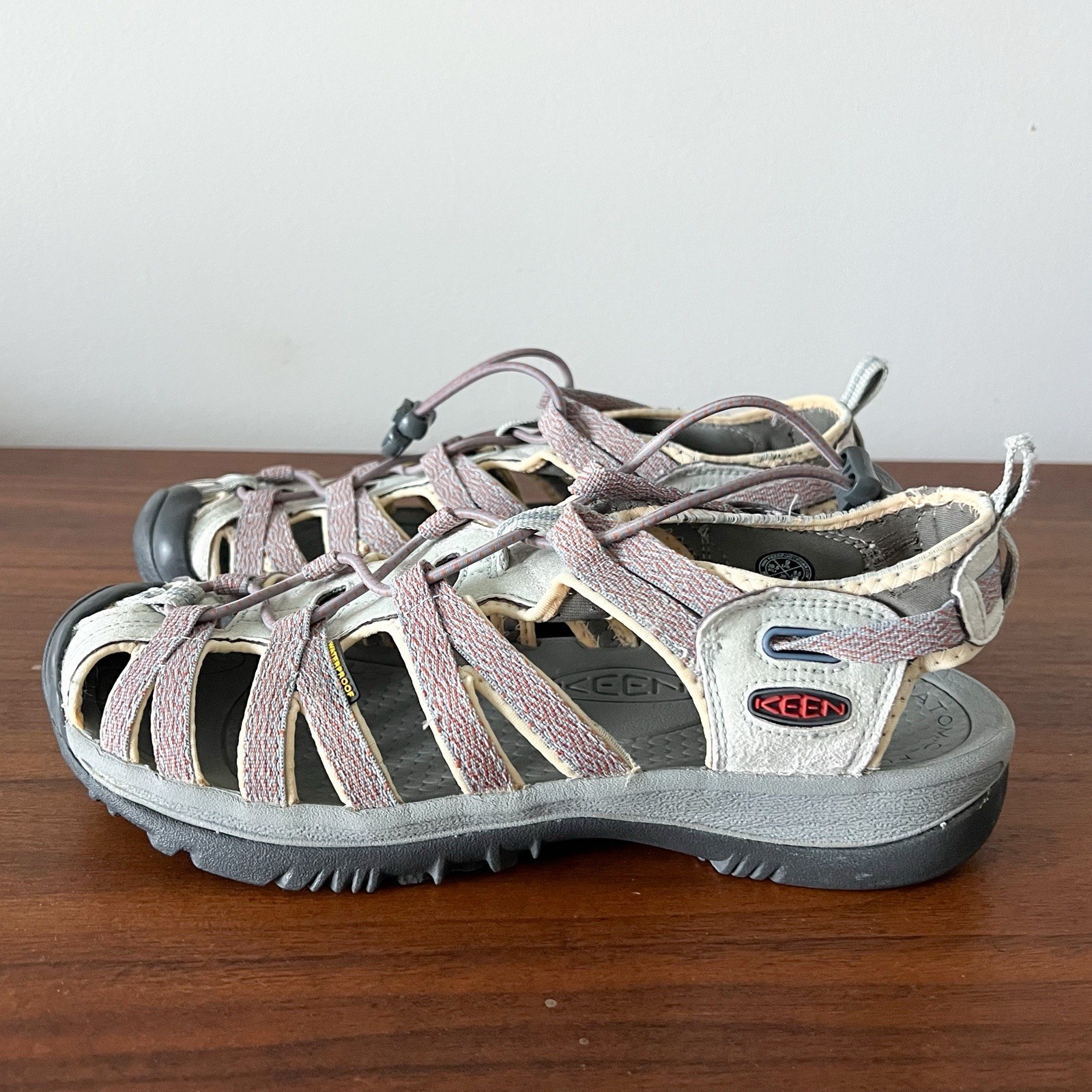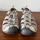 KEEN women's sport sandals built for comfort, stability, and outdoor adventures. Designed with KEEN's signature toe protection and quick-lace system, these sandals are ideal for hiking, walking, travel, or everyday wear. Details: • Brand: KEEN • Women's Size: 9 • Style: Sport / Hiking Sandals • Color: Gray with pink accents • Waterproof construction • Adjustable bungee lace system • Protective rubber toe cap • Cushioned footbed with grippy outsole Condition: Pre-owned. Normal wear from use, including outsole tread wear and light cosmetic signs consistent with outdoor use. No structural issues. Please review all photos closely for exact condition.