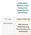 Product Details: Sole material: Rubber Shaft height: 2#inches About this item COMPOSITE TOE: Left and right asymmetrical, non-metallic carbon-fiber toes, a composite material, offer an unobtrusive fit and are 15% lighter than steel; The Vista Energy Low work shoes meet or exceed ASTM F2412 and F2413 F I/75 and C/75 Standards TRACTION: Oil- and slip-resistant, non-marking, rubber outsoles are used for improved traction that meet or exceed ASTM F1677 MARK II and ASTM F2913 SATRA Non-Slip Testing Standards; Non-mutilating uppers reduce the chance of marking surfaces FIT & CONSTRUCTION: Built on a specific women’s foot form that is wider than the industry norm for improved fit & comfort; The sizes listed are women’s and fit true to size; Made with KONNECTFIT heel capture system for a locked-in feel SUPPORT: These shoes are made with KONNECTFIT heel-capture system for a locked-in feel, and 100% non-metallic construction for passing through metal detectors; A nylon shank used for midfoot support, and torsion stability COMFORT: Made with KEEN.ReGEN a lightweight, compression-resisting midsole providing 50% more energy return than standard EVA foam for lasting support and comfort; CleansportNXT provides natural odor protection using probiotics Description: Designed for a woman’s foot and built with KEEN.ReGEN’s proven midsole cushioning, offering 50% energy return with every step, a breathable, engineered mesh upper, carbon-fiber toes, and the KonnectFit heel capture system, this work sneaker is ready for even the hottest of workdays. Weighing 12.8 oz / 364 g (per shoe) the Vista Energy work sneakers for women are built off KEEN's traditional wider footwear form. KEEN Utility products offer removable insoles. These dependable work shoes are great for light-duty work in maintenance, manufacturing, warehouse and distribution. KEEN Utility sources leather from tanneries certified by the Leather Working Group (LWG) which is the gold-standard for responsibly sourced leather. KEEN Utility believes in creating work boots that make work and life better. To further support that mission, KEEN Utility has been “Putting Good to Work” through its non-profit partnerships within the Project Build program. From helping put veterans back on their feet to supporting conservation corps work across the country, KEEN Utility puts good to work, first.