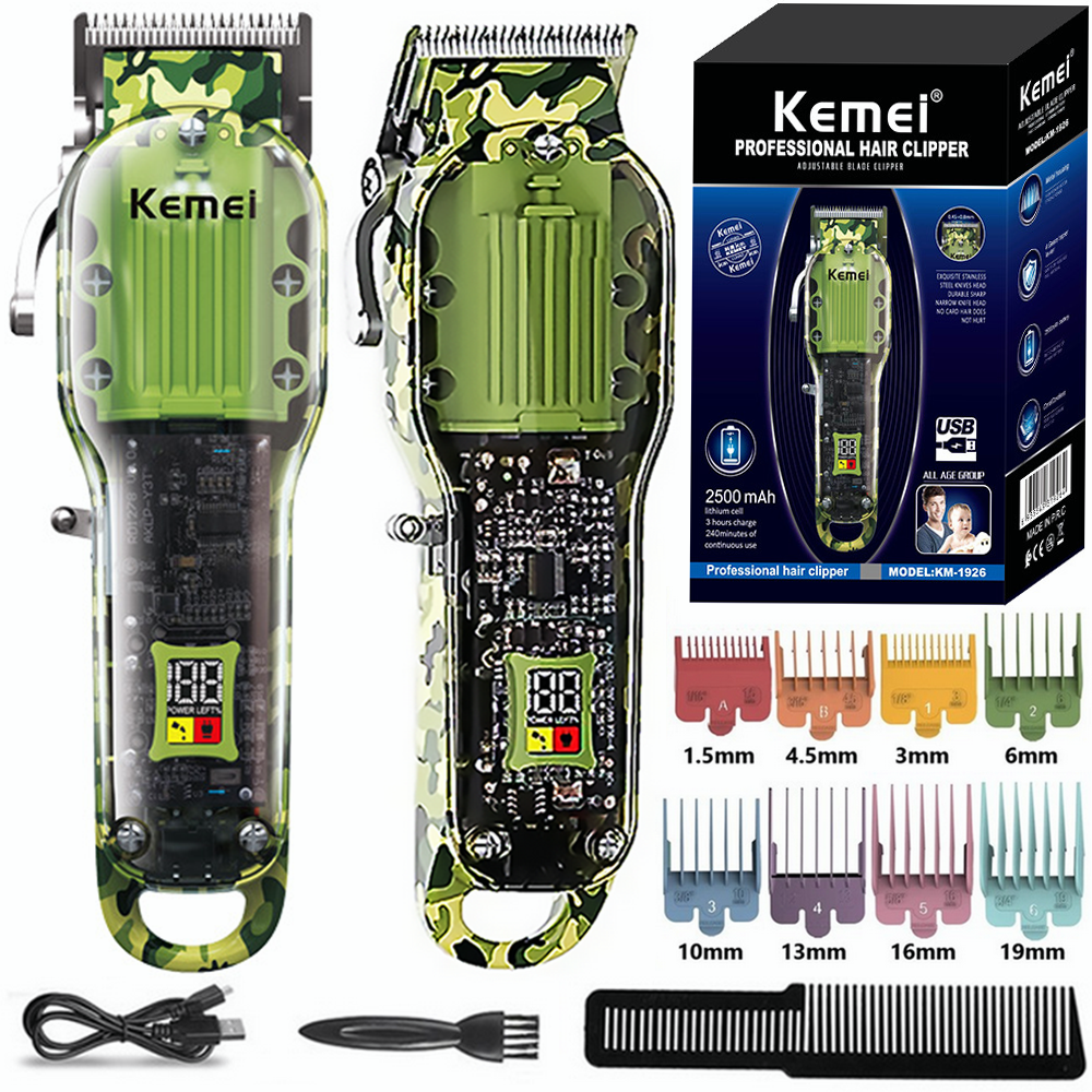 Features: 1.Powerful long-life motor cute-angled moving blade, sharp and durable 2.Considerate and digitalized smart LCD display for reminder, 6300rpm/min strong power, Less than 55dB low noise, Once charging can last up to 240-min working time 3. Newly designed acrylic material, sturdy and durable, with a beautiful appearance, you can directly see the internal parts. Specification : Brand : KM-1926 Machine Weight : 267g Machine Size : 18*4.5*3cm / 7*1.7*1.2 Inch Limit Combs : 3 / 6 / 10 / 13mm Voltage : 100-240V Frequency : 50/60Hz Batt e ry : 8W Charging Time : 3 Hours Using Time : 240 Mins Power Supply : USB Recharge Cleaning Way : Cleaning With Brush Package list : 1 * Hair clipper 8* Limit combs (1.5/3/4.5/6/10/13/16/19mm) 1 * USB cable 1 * Cleaning brush 1*Manual