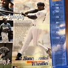 Own a piece of baseball history with this vintage 1997 Honey Frosted Wheaties cereal box featuring the legendary Ken Griffey Jr. This original box is a must-have for any Seattle Mariners fan or baseball collector. The box was produced in the United States and is a unique addition to any sports memorabilia collection. This rare find celebrates the iconic Ken Griffey Jr. and his contribution to the sport of baseball. The cereal box is a perfect addition to any sports room or display case. Don't miss out on the opportunity to own this piece of baseball history.
