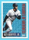KEN GRIFFEY JR. Baseball Singles, Inserts, & Parallels Shipping in the United States is $1.50 for the first item and free for any additional items in any of my Complete Your Set categories, any cards shipped outside the United States is $15.00 per order and this covers all cards purchased. If you need a picture of a card or have any questions please feel free to e-mail me. Thanks, Derek If your looking for some more Ken Griffey Jr. cards please check out my other two you pick listing of Ken Griffey Jr. for more cards including inserts!!!