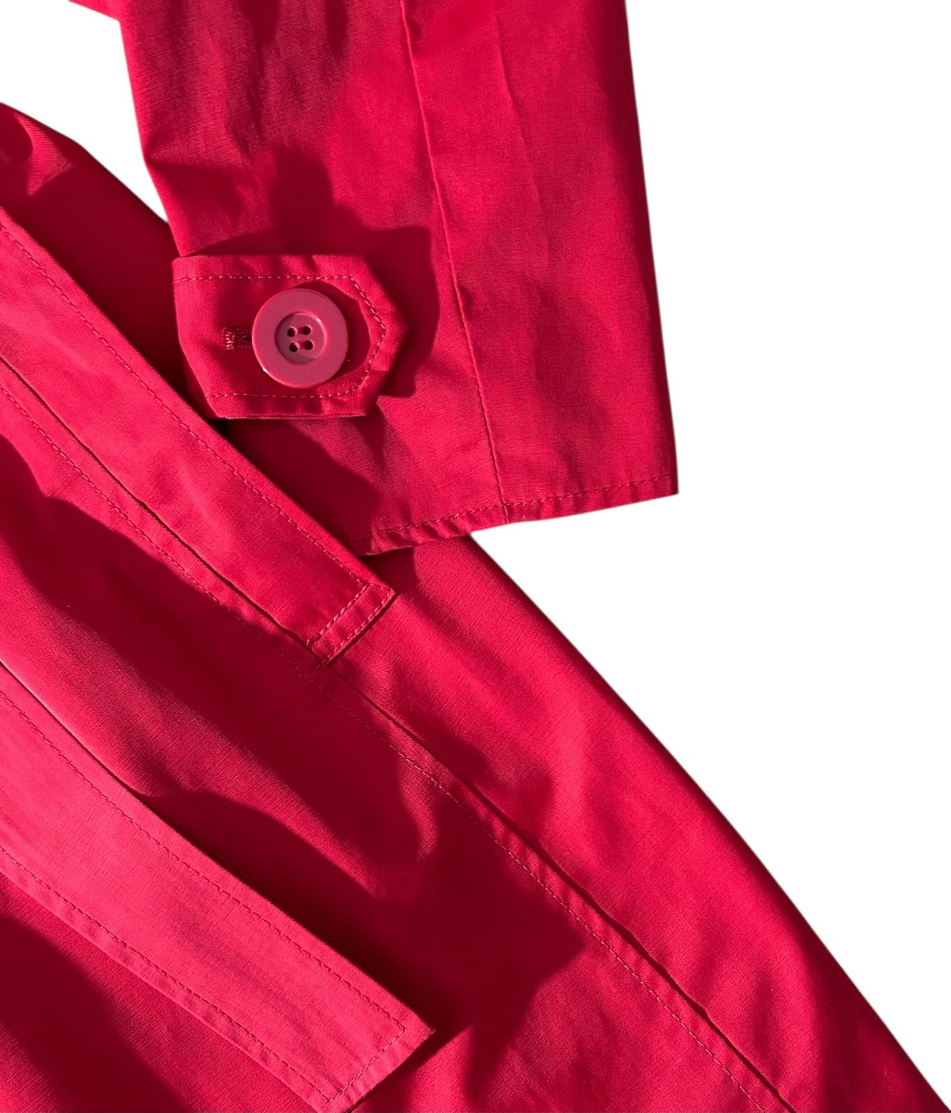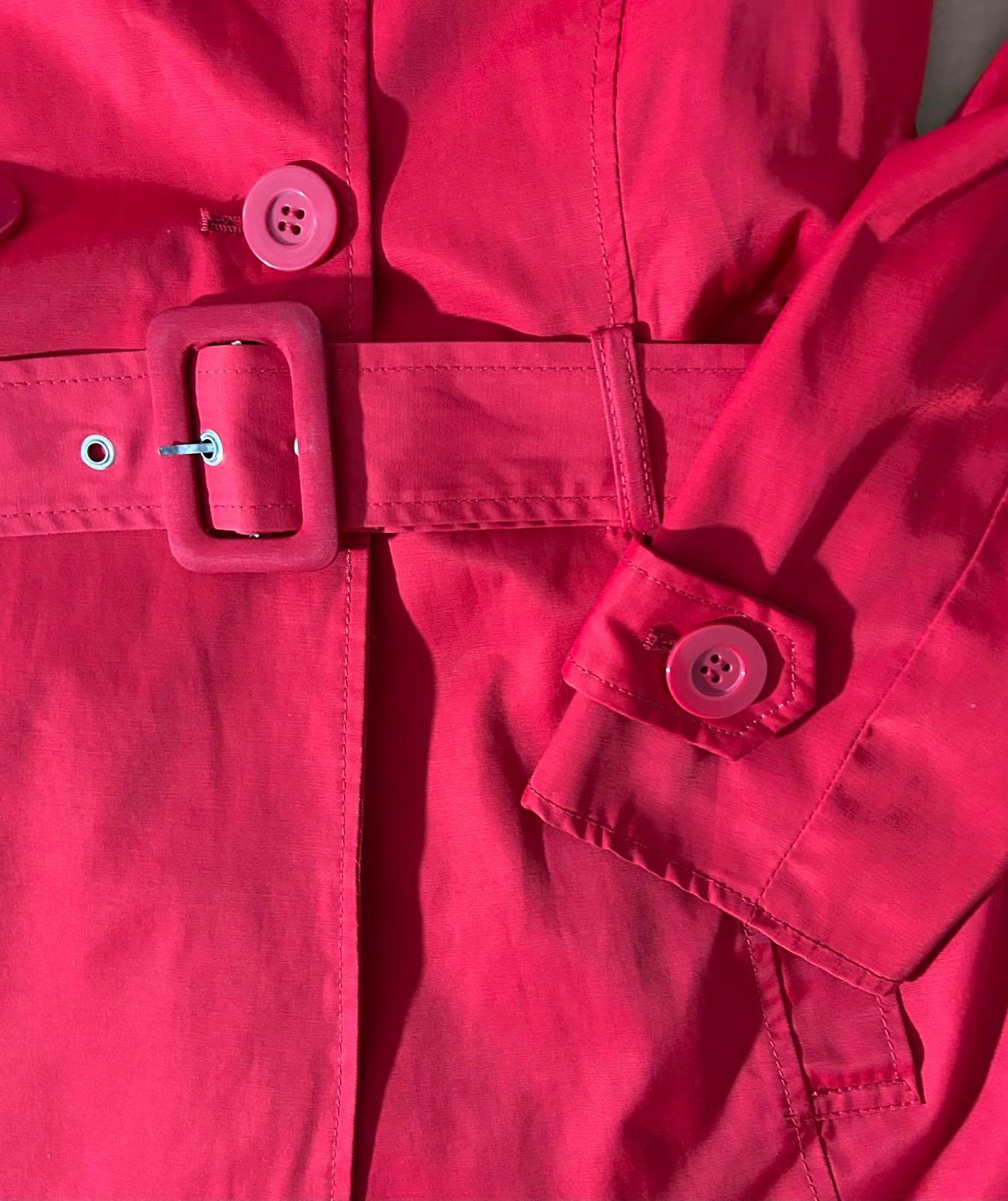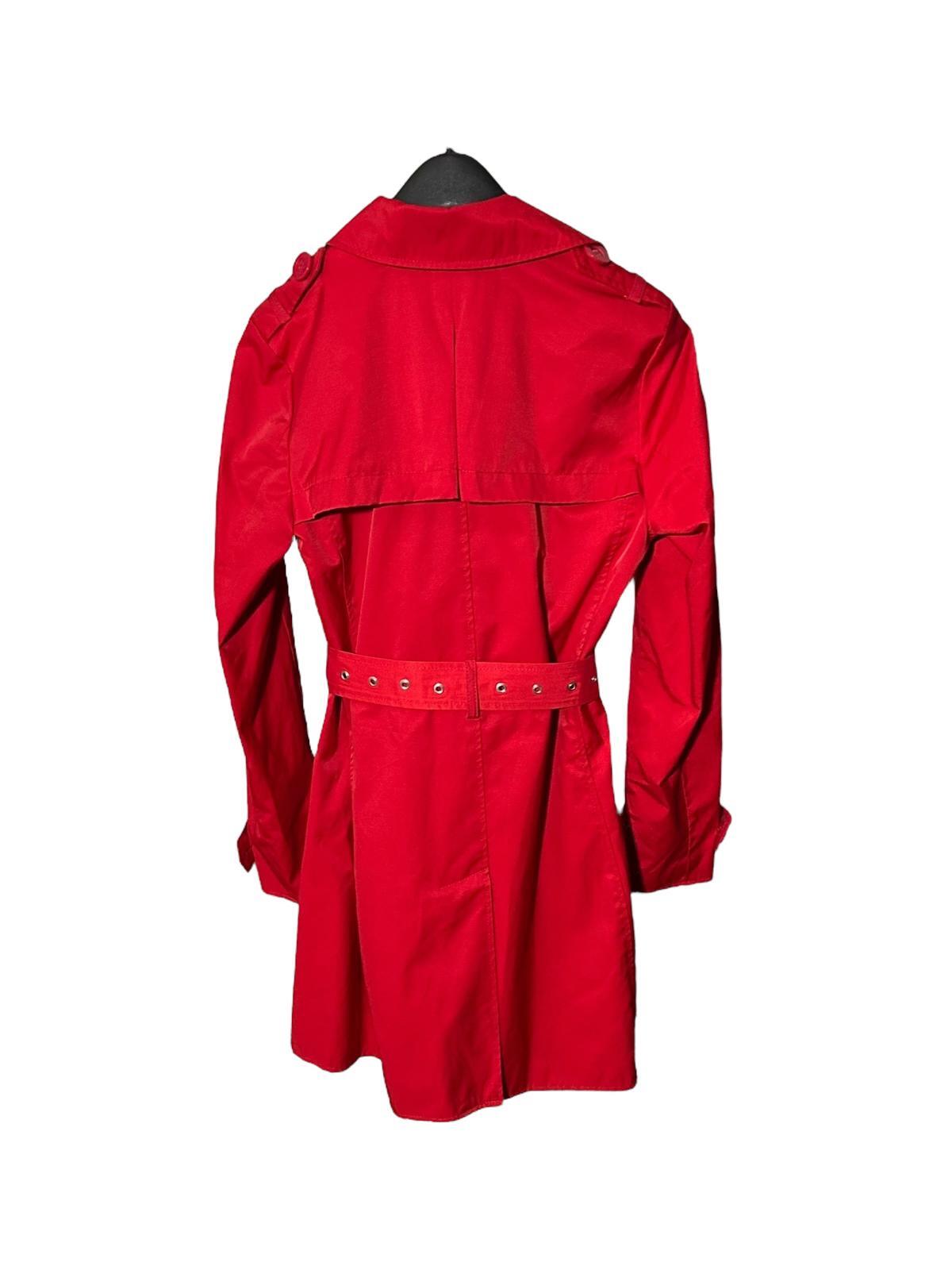 A multi-season classic that is always in style, you'll be warm, dry, and chic in this stunning Double-Breasted Red Trench Rain Coat from REACTION by Kenneth Cole...Featuring a waist-cinching Buckle/Tie Belt, and Cuffs with Button/Belt detail, this lightweight mid-length beauty is perfect for any weather and any event...Available in a Women's Small (see measurements below). New Without Tags / Original Retail: $215 --- SAME DAY SHIPPING for Orders Received by 3:30 PM EST --- • Product Details: All-Weather/Water Resistant; Double Breasted/Button Front Closure; 2 Side Pockets; Buckle/Tie Belt; Shoulder Button Epaulets; Back Vent; Button/Belted Cuffs; Silky Red Lining for easy On-Off • Condition: New Without Tags • Size: Women's Small • Color: Red • Shell Fabric: Cotton / Polyester • Lining: Polyester • Measurements: Chest (Pit to Pit): 17.5" Sleeve Length (shoulder seam to end of Sleeve): 24" Length (Top of back collar to bottom of hem): 23.5"